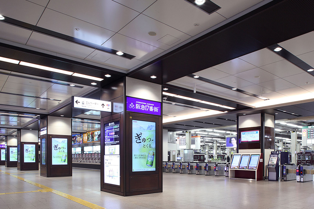 阪急電鉄のターミナルである梅田駅。周辺開発が活発化するなか、“劇場空間 阪急スタイル”をコンセプトに、内装イメージを一新するリニューアルを実施した。照明による演出効果などを活かして「華やかさ」や「エレガントさ」をより追求し、大阪梅田地区の「顔」にふさわしい、洗練された統一感溢れる駅空間へと生まれ変わった。