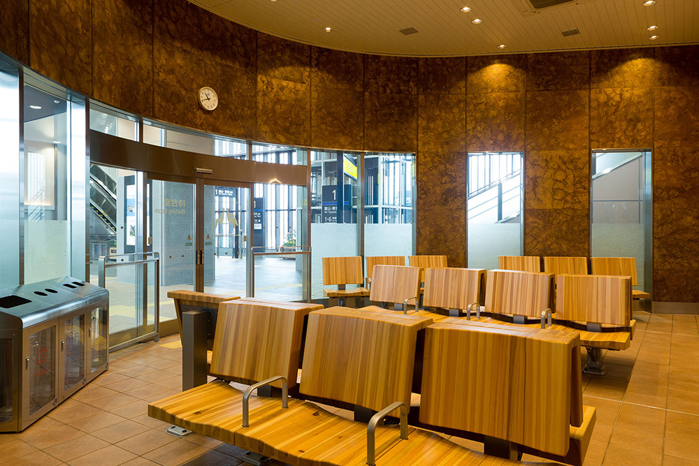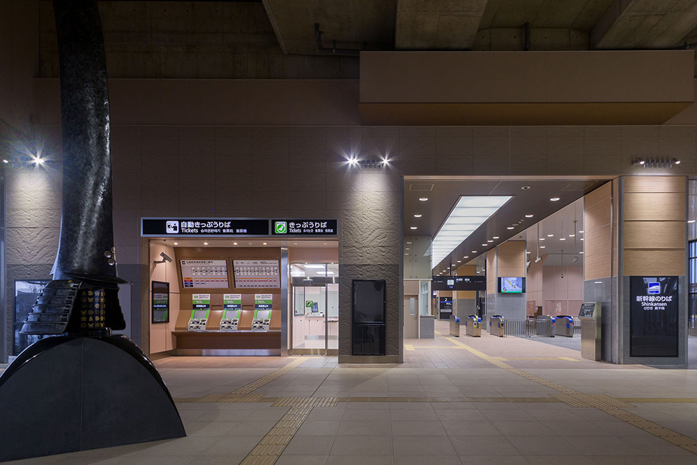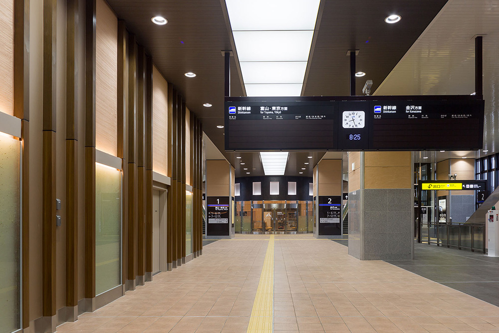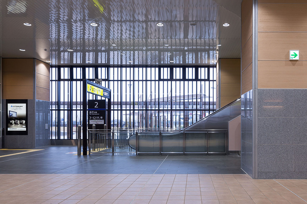 飛越能の玄関口として期待される新高岡駅は、「飛越能の自然・伝統・技術が融合し、新たな時代を具現化するデザイン」というコンセプトのもと、歴史に育まれた瑞龍寺の回廊や縦格子などをデザインモチーフとし、リズミカルな縦のライン、高岡のアルミ鋳物や銅板などの地場産材料を各所に設える事により高岡らしさを表現している。