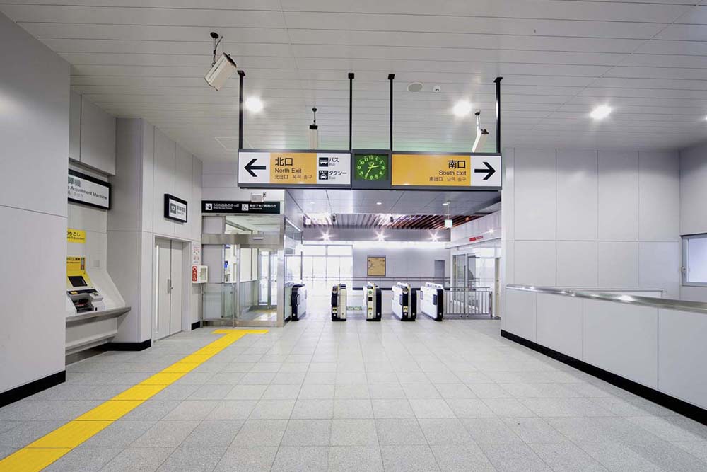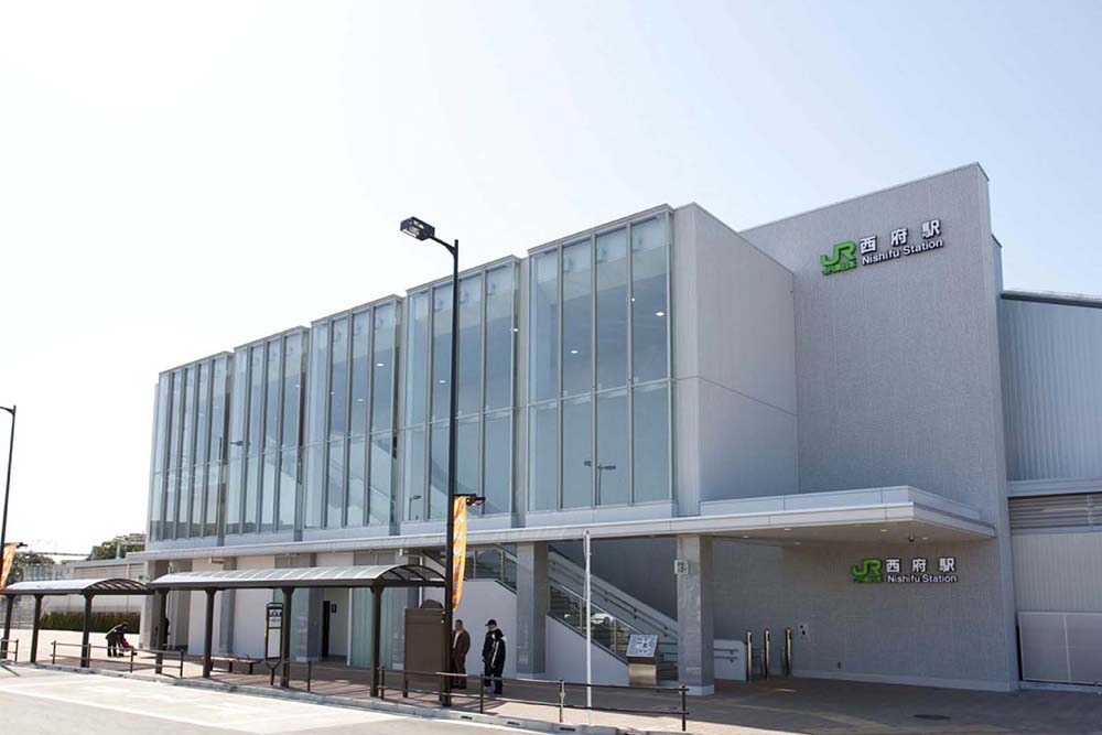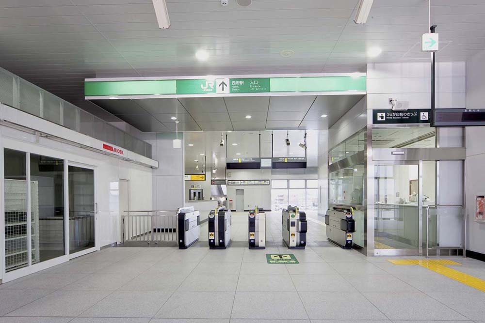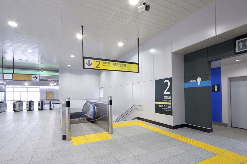 西府駅は土地区画整理事業の核施設として駅広整備などとともに、南武線分倍河原・谷保駅間に乗降人数26,000人/日(平成34年度)を見込んだ新駅として設置した。線路の南側・北側を結ぶ、南北自由通路と橋上駅舎を線路上空部分に設置した。計画に合せて、バリアフリー設備として、自由通路の南北それぞれにESC2基とEV1基、駅部は上り下りの各ホームにESC2基とEV1基、多機能トイレを含む旅客トイレを1箇所整備しました。新駅は平成19年3月に工事着手し、平成21年3月に供用開始しました。