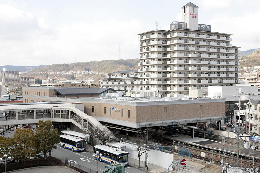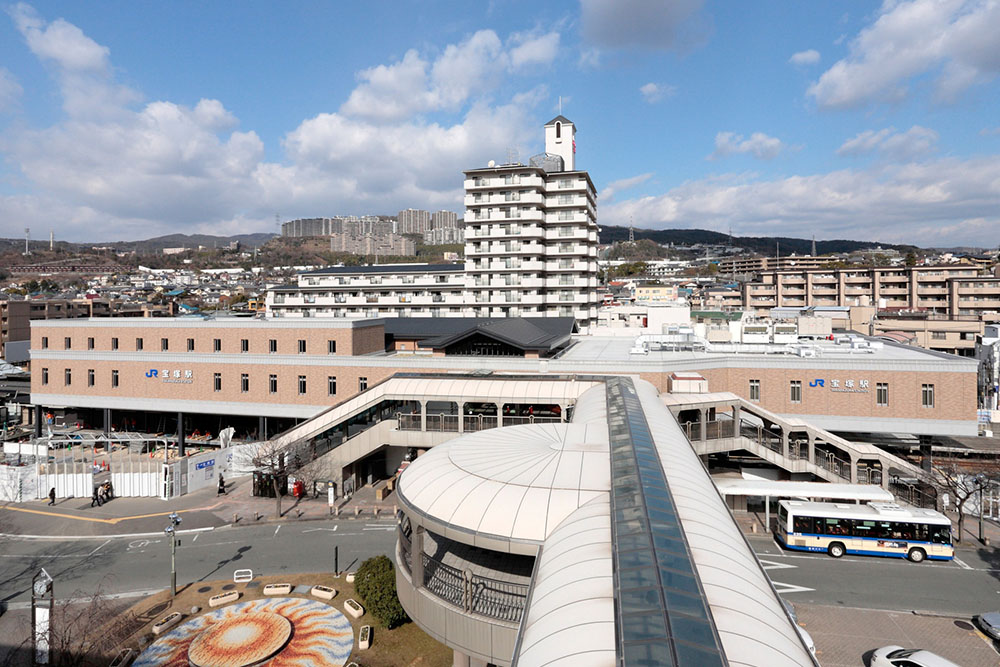 宝塚市が進める駅前広場再整備事業に地平駅舎が支障することになり、旅客サービスの向上及び阪急宝塚駅との乗り換えの利便性を図るため、既存自由通路の改修を行い、それに取り付く形で駅の橋上化及びバリアフリー化を行なった。また自由通路対面側にも新たに人口地盤を設け商業施設(エキマルシェ宝塚)を併設した。