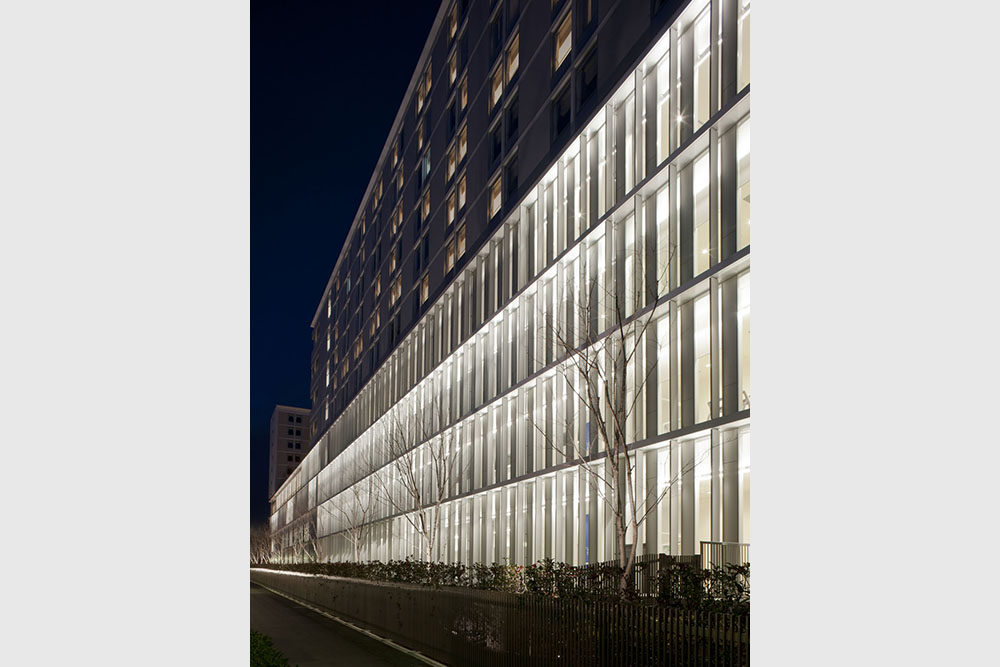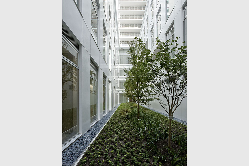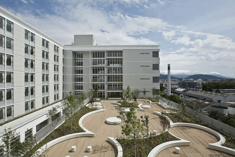 2か所の中庭を設けることにより、光や風等の自然エネルギーを効率的に活用し、方位に応じたルーバーや、LOW-eガラス、屋上庭園の採用で空調負荷低減を図った他、氷蓄熱、LED照明の採用等省エネ化を徹底した。地域性を考慮し免震構造を採用したほか、車椅子利用者に配慮し、「誰でもトイレ」等を設置した結果、CASBEE「S」ランクを取得している