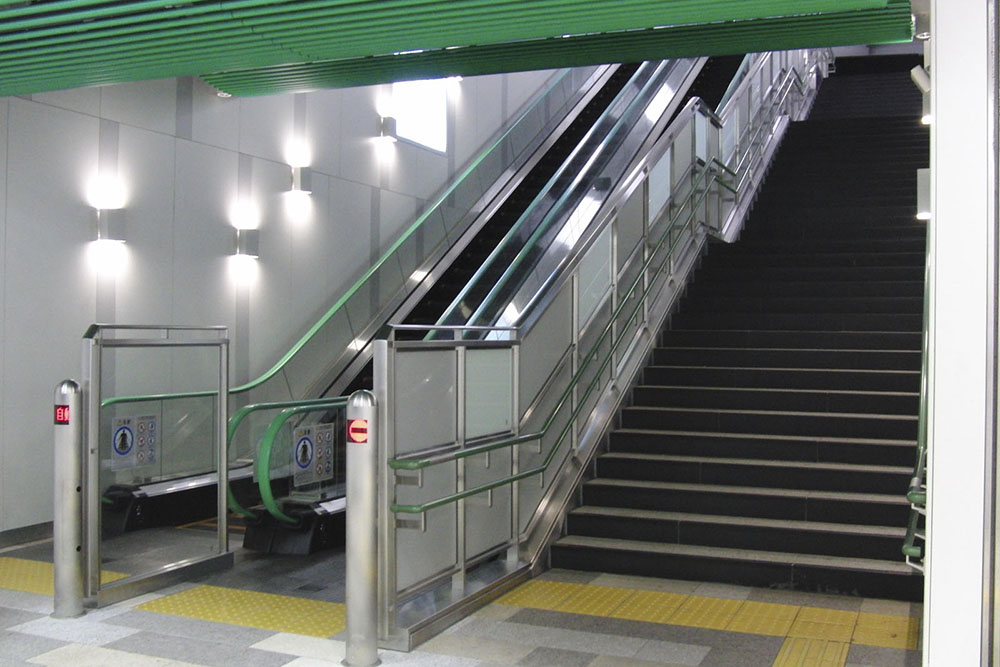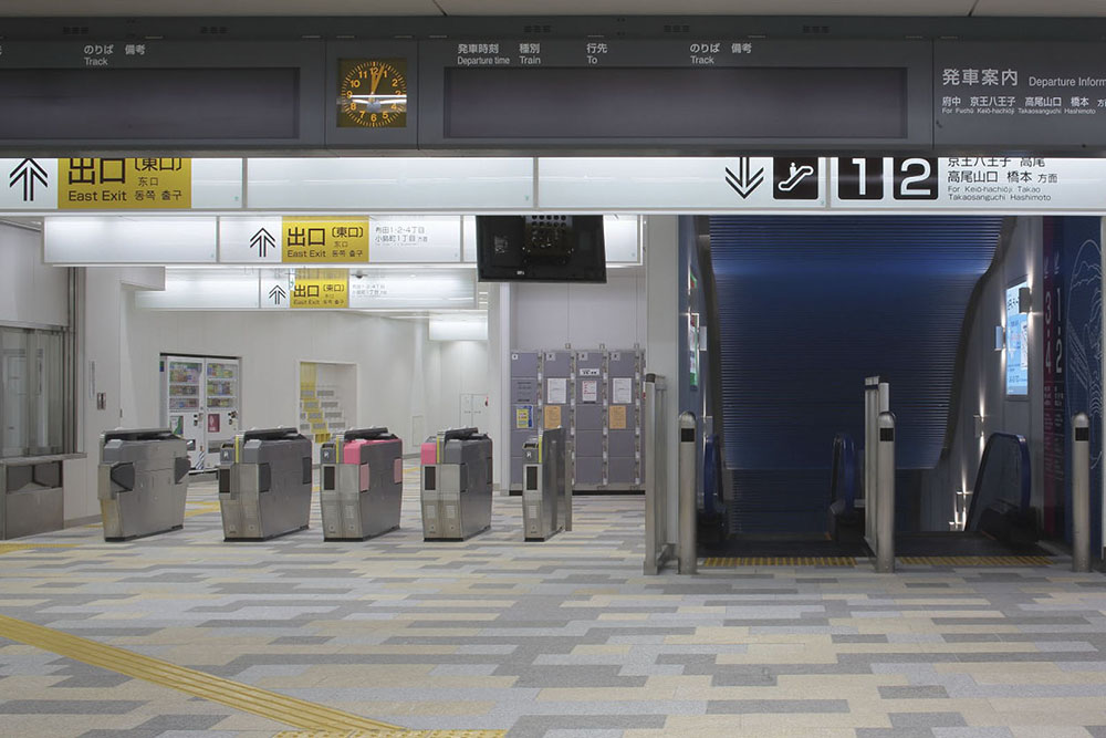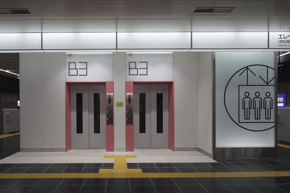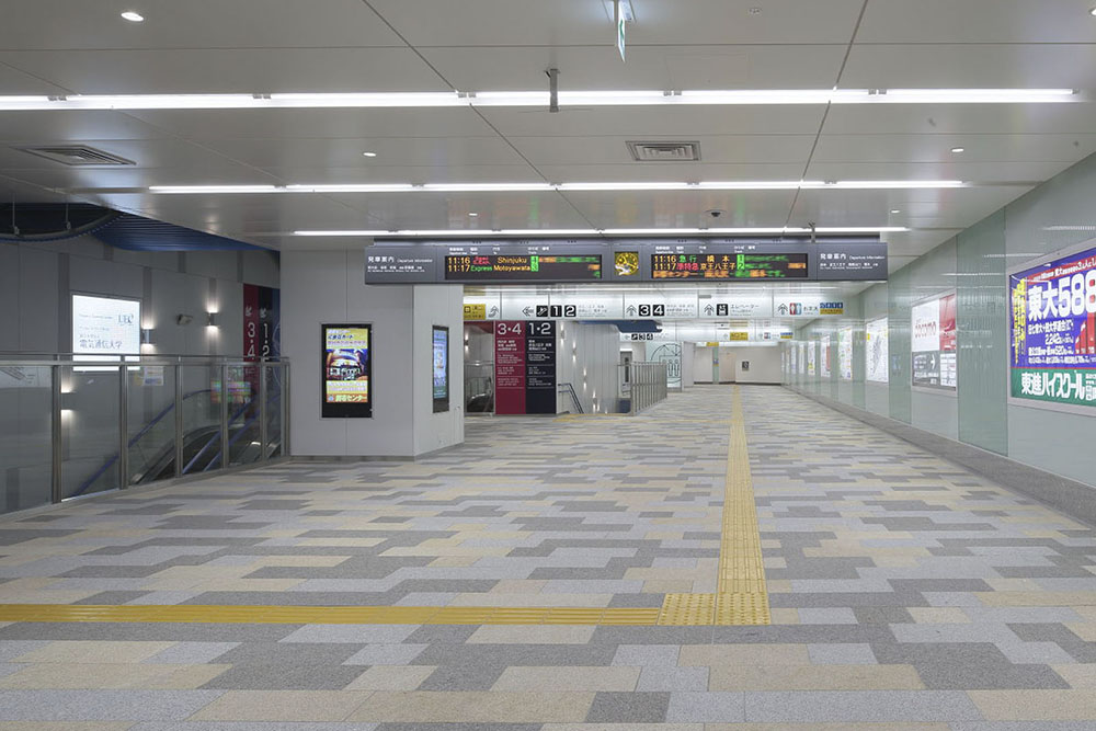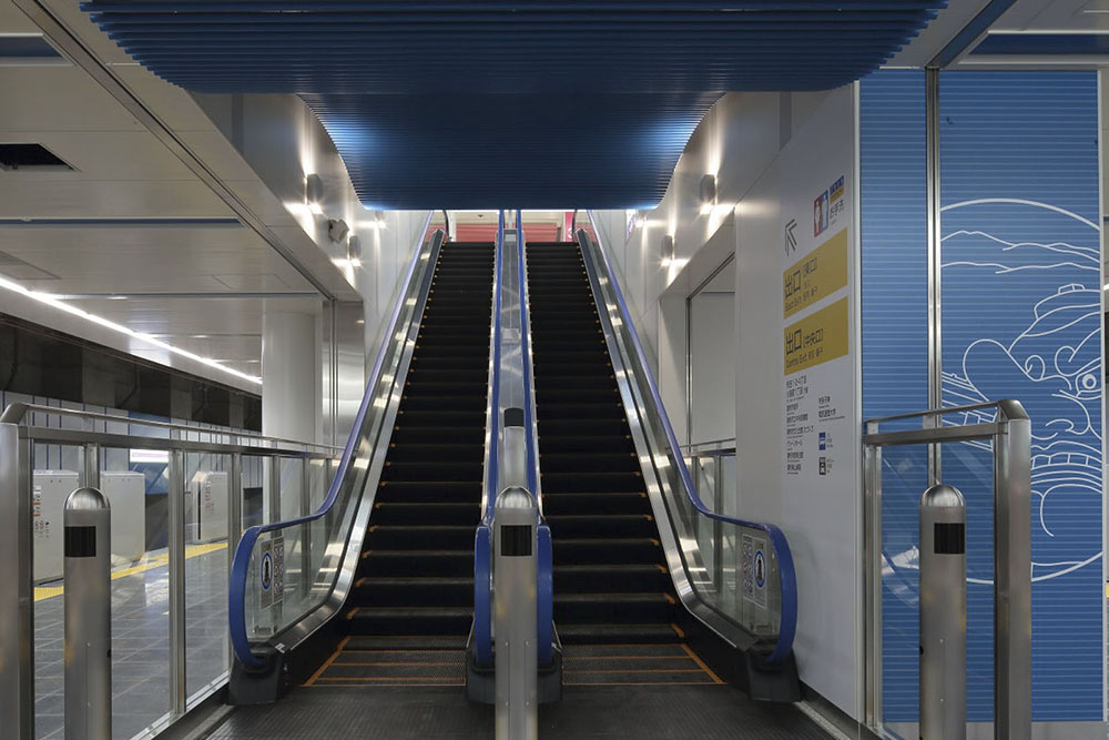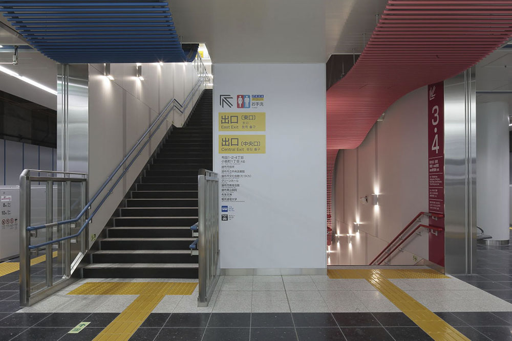まちを象徴する「布」をデザインし、駅前広場と連続した駅空間とする事で地下駅が失いがちな「まちの玄関」としてのランドマーク性向上とともに、行先毎にカラーリングされた「布」を模したルーバーを階段・エスカレーターに設置し、上下ホームが積層する複雑な空間の理解度を向上すると同時にデザインの独自性を高めた。