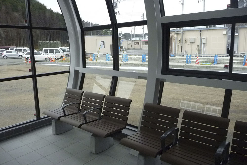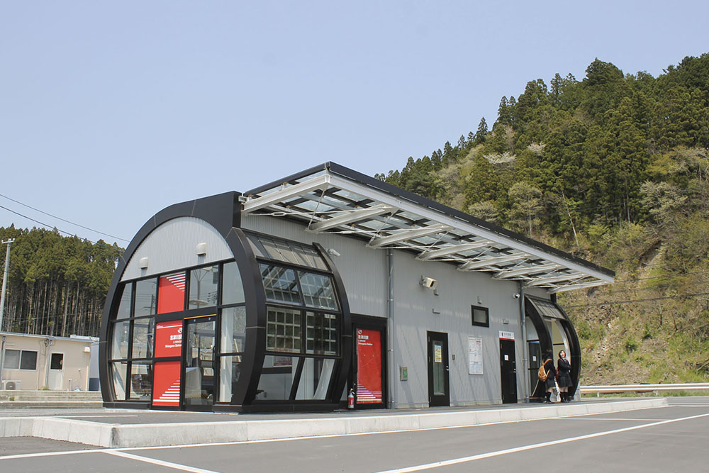 BRT『志津川駅』のコンセプトは絆、人と人との出会い、絆と絆とを結びつける縁(円)をキーワードに『地域の人と地域とともに生きる駅』としている。そのコンセプトをもとに妻側の断面を丸い形にし、待合室、販売窓口、駅事務室、旅客便所、乗降場を一体的に配置した中規模駅舎である。仕様は屋根材がガルバリウム鋼板、外壁がカーテンウォール、サイディングボードとした。