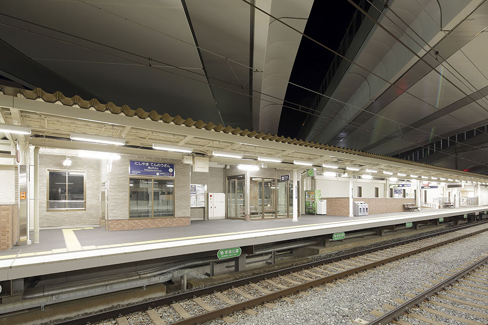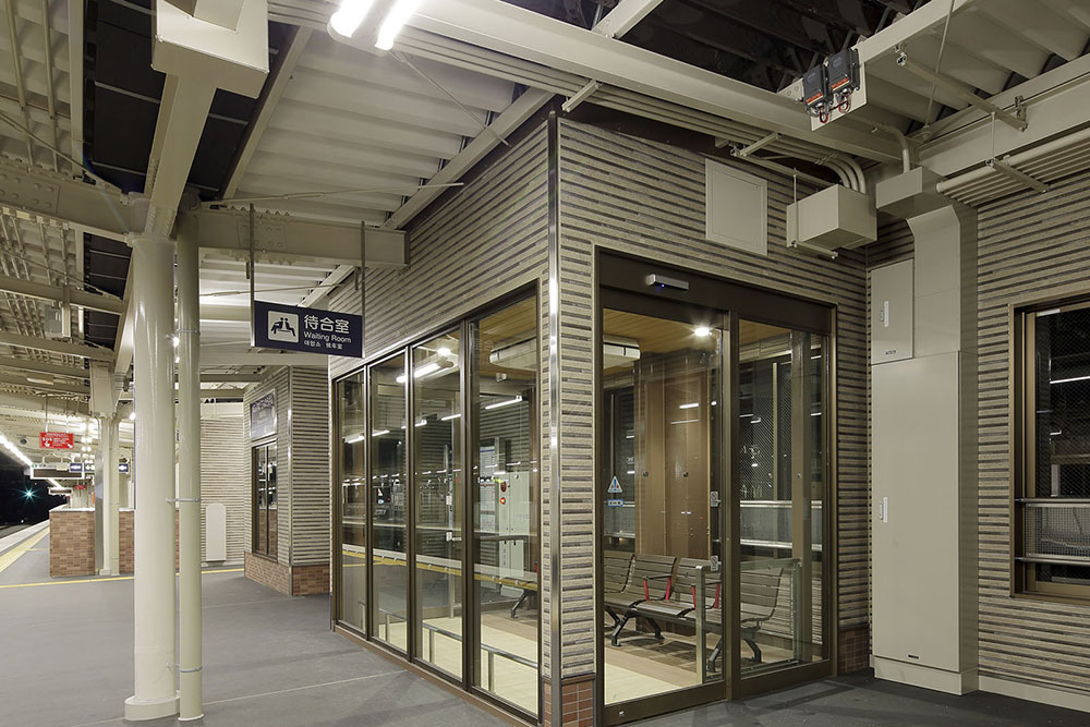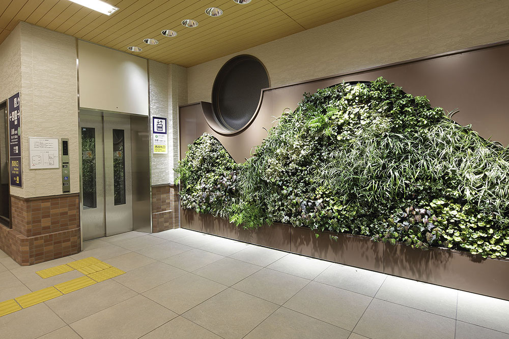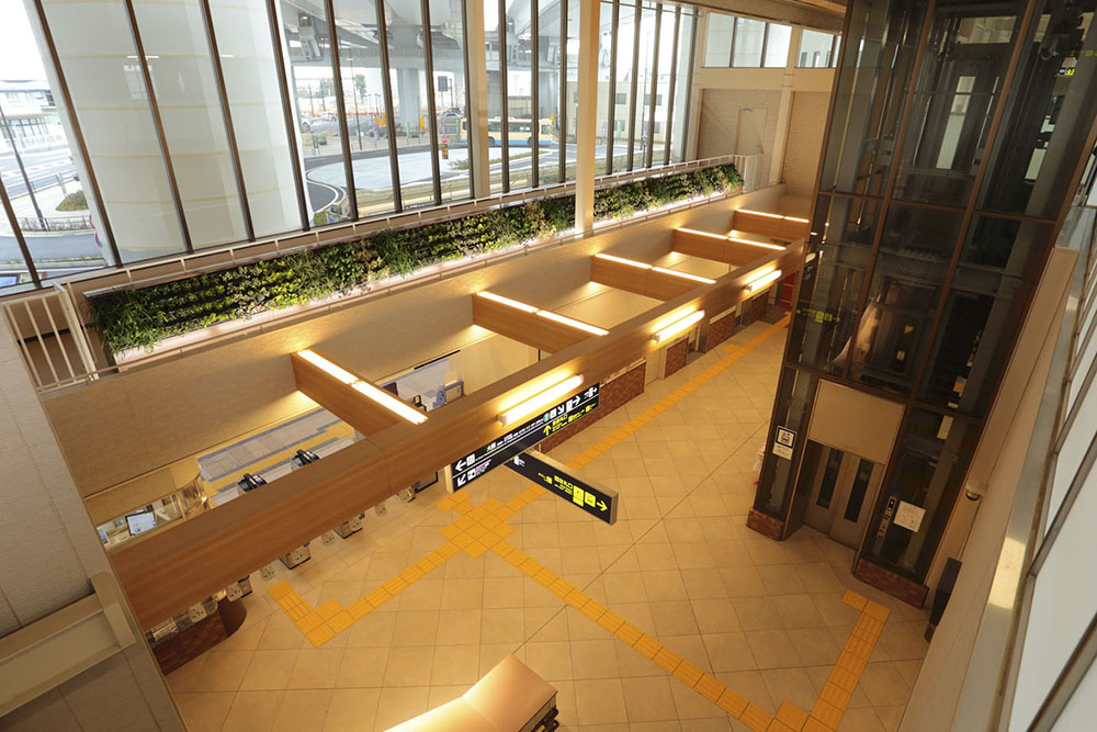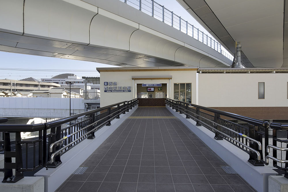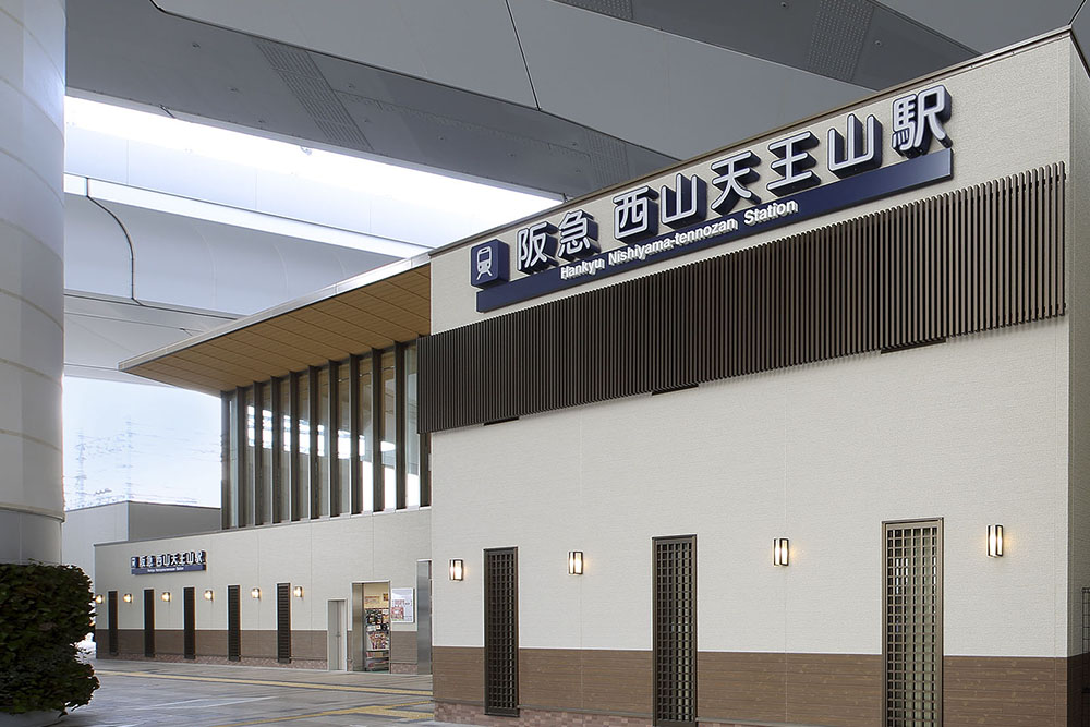 西山天王山駅は、高速道路「京都縦貫自動車道」との結節機能を持ち、鉄道と高速バスやマイカーとの乗継が容易で多様なアクセス方法実現と地域交流の可能性を広げる新しい駅です。「和モダン」をデザインコンセプトに周辺環境との調和を図り、ガラス張りの吹抜や壁面緑化を導入し、明るく開放的で潤いのある地域玄関口に相応しい駅となりました。