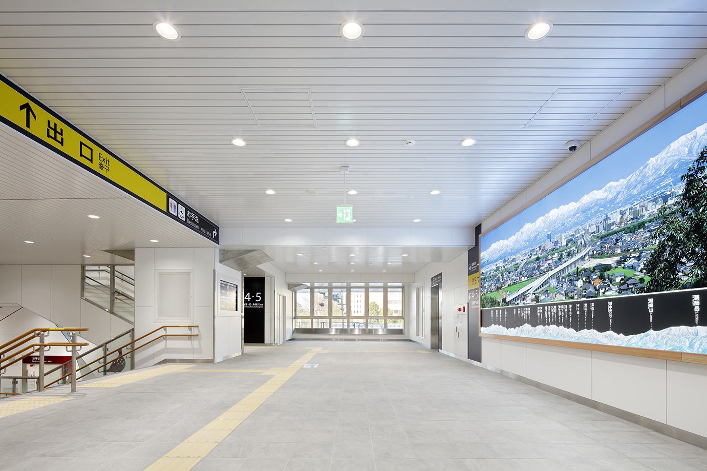 富山駅は自由通路およびLRT南北接続を含む連続立体交差事業の一環として高架化された。新幹線駅と共通の「立山あおぎ 心ときめく 光の舞台」をコンセプトに、縦ラインと白を基調としたファサード、立山杉に見立てた全覆い上家の柱を設えた。ホーム階はあいの風とやま鉄道線と新幹線との間に壁を設けないことで一体的な空間を構成した。