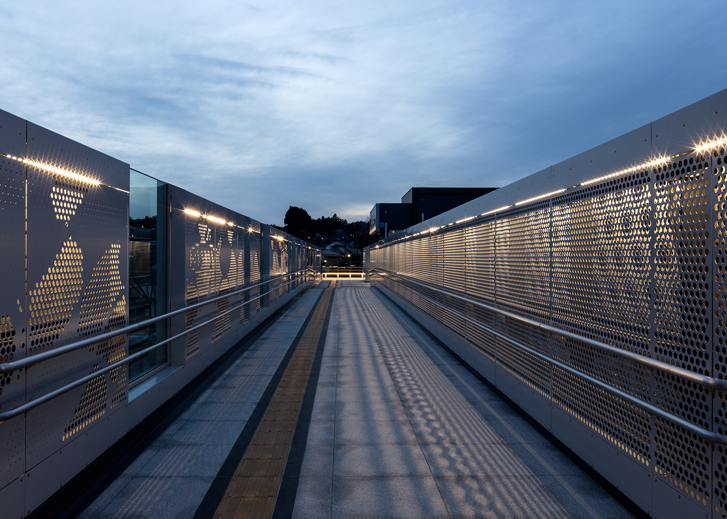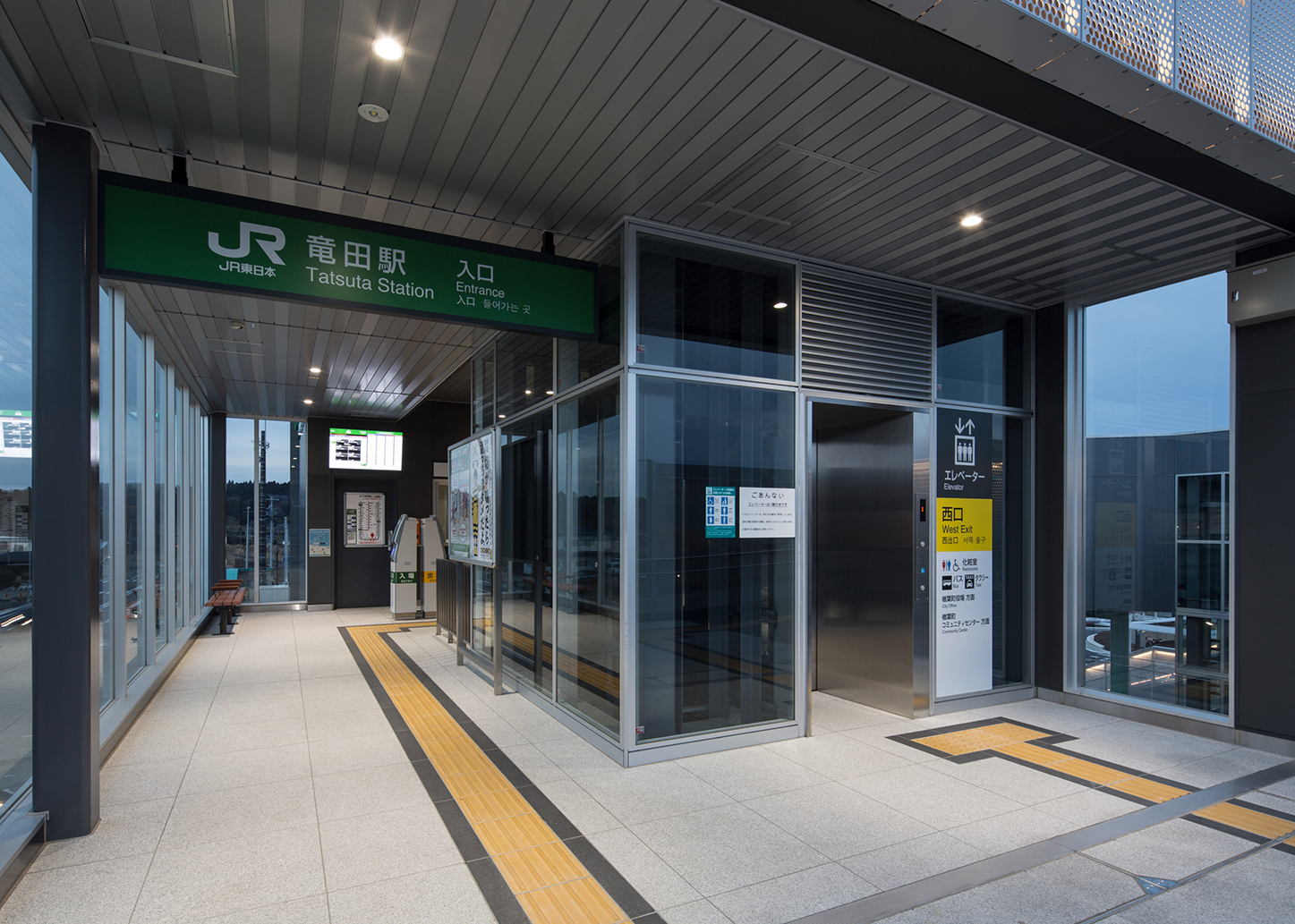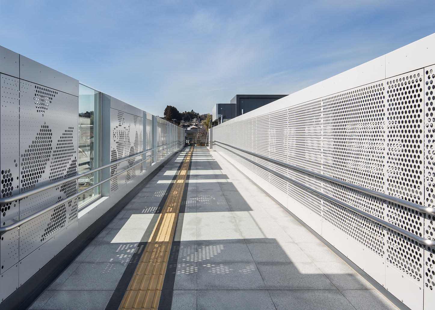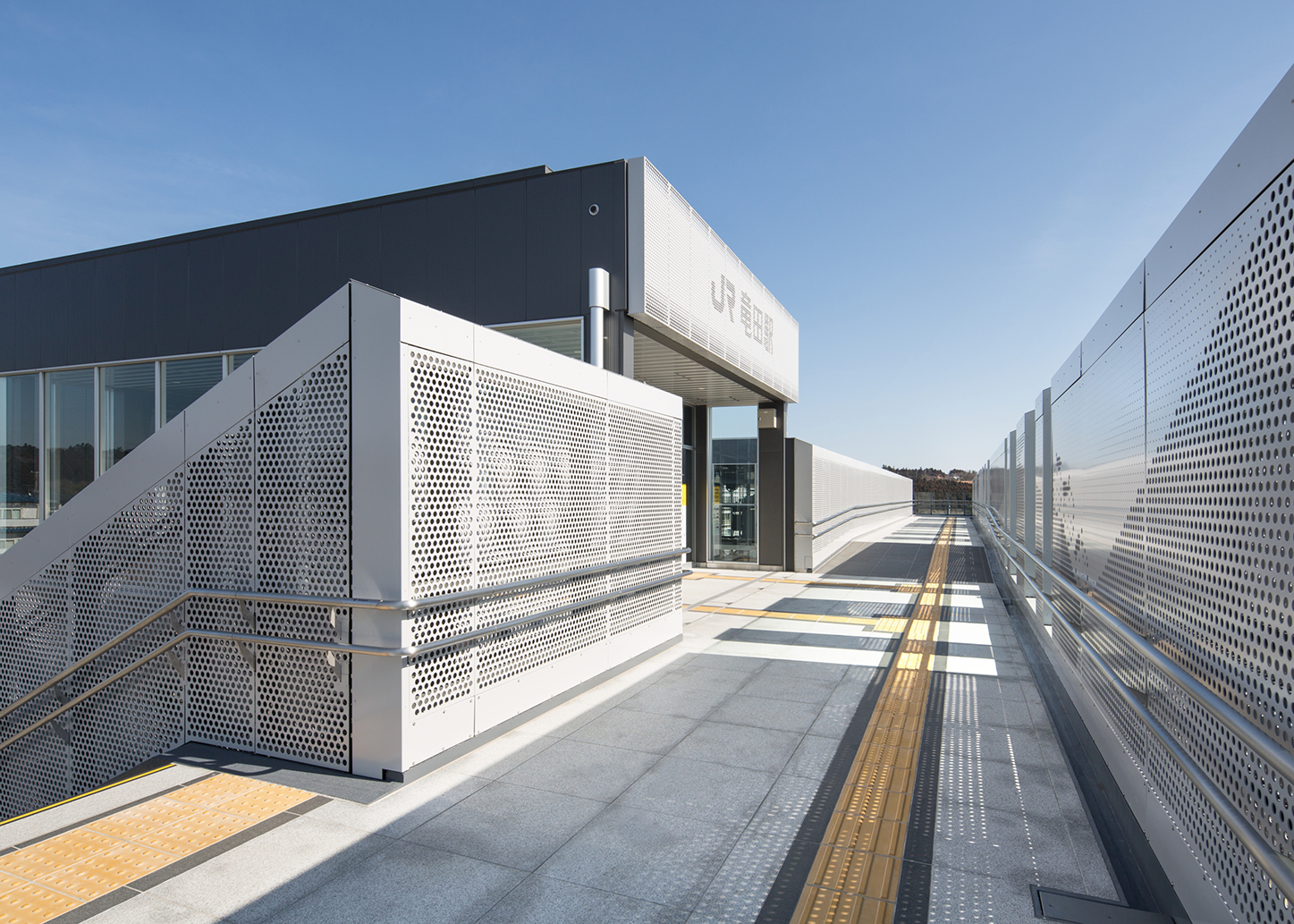 駅舎内には駅前広場や地域の景色を眺めることができる窓を設け、自由通路ではパンチングメタルを用いることで風景を透過させると共に楢葉町を想起させるデザインを施した。