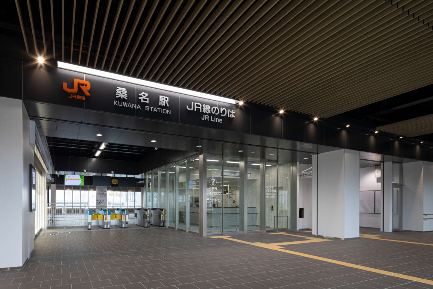 自由通路から駅広を見渡せるようカーテンウォールを設置し、まちへの広がりを表現した。自由通路外観は七里の渡し跡にある「一の鳥居」を柱・梁・屋根により立体的に表現し、外装材には木製ルーバー(和)と煉瓦調タイル(洋)を組合せ「和洋折衷」を表現、初代桑名藩主本多忠勝の兜に用いた「黒」を基調にデザインし、桑名の歴史を取り込んだ。