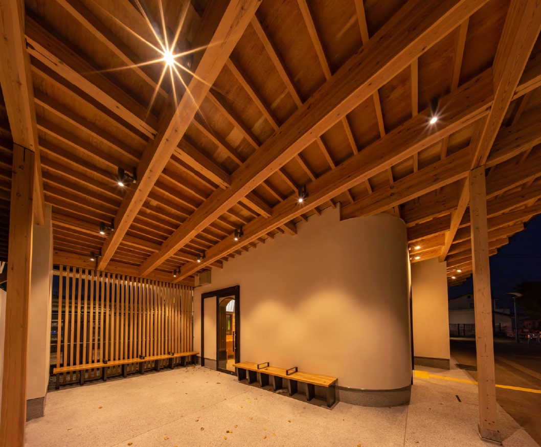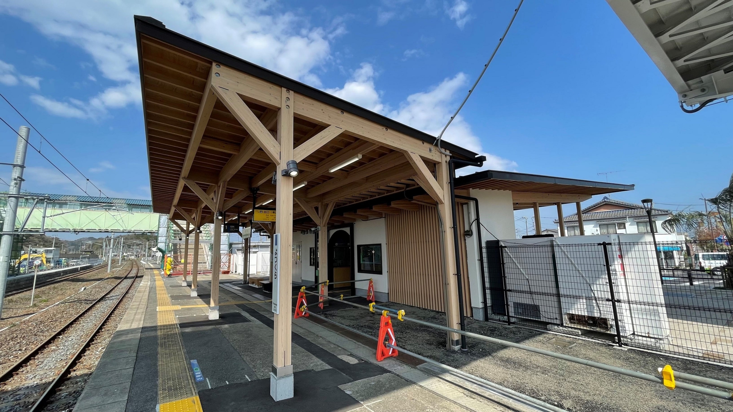東西地域の一体化を目的に、自治体の自由通路整備に合わせて、「長く愛される、地域の魅力、憩いの場」をコンセプトとして駅舎整備を行った。