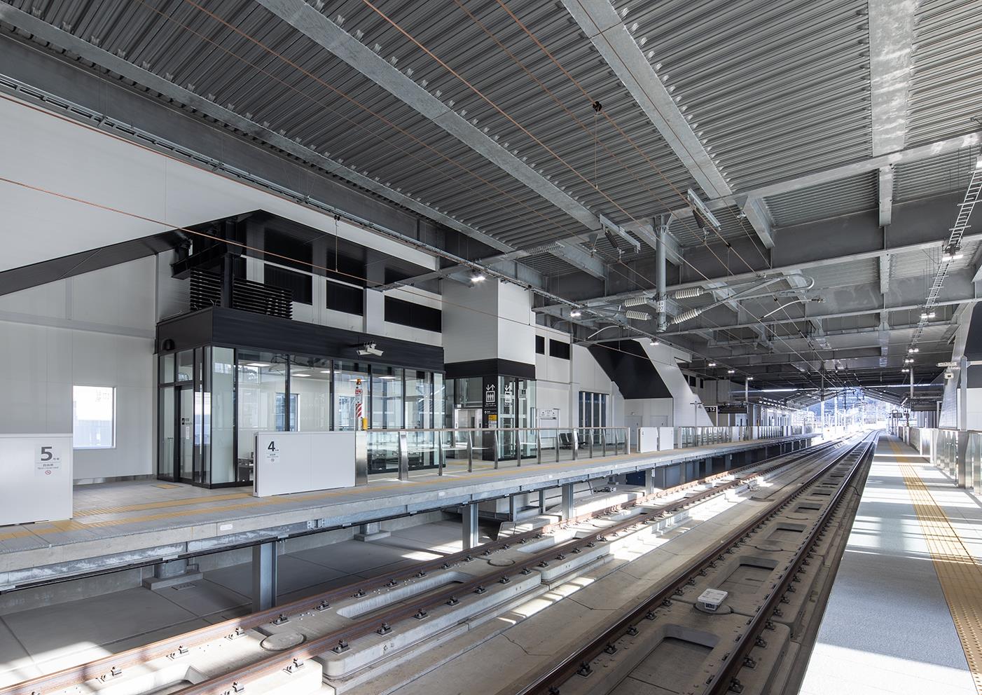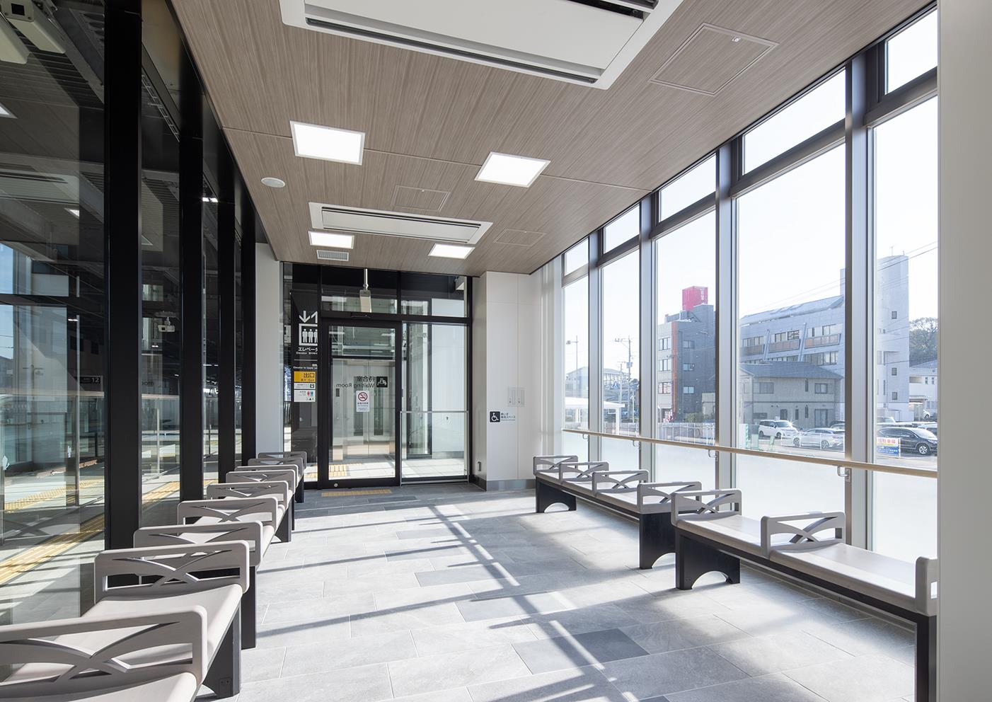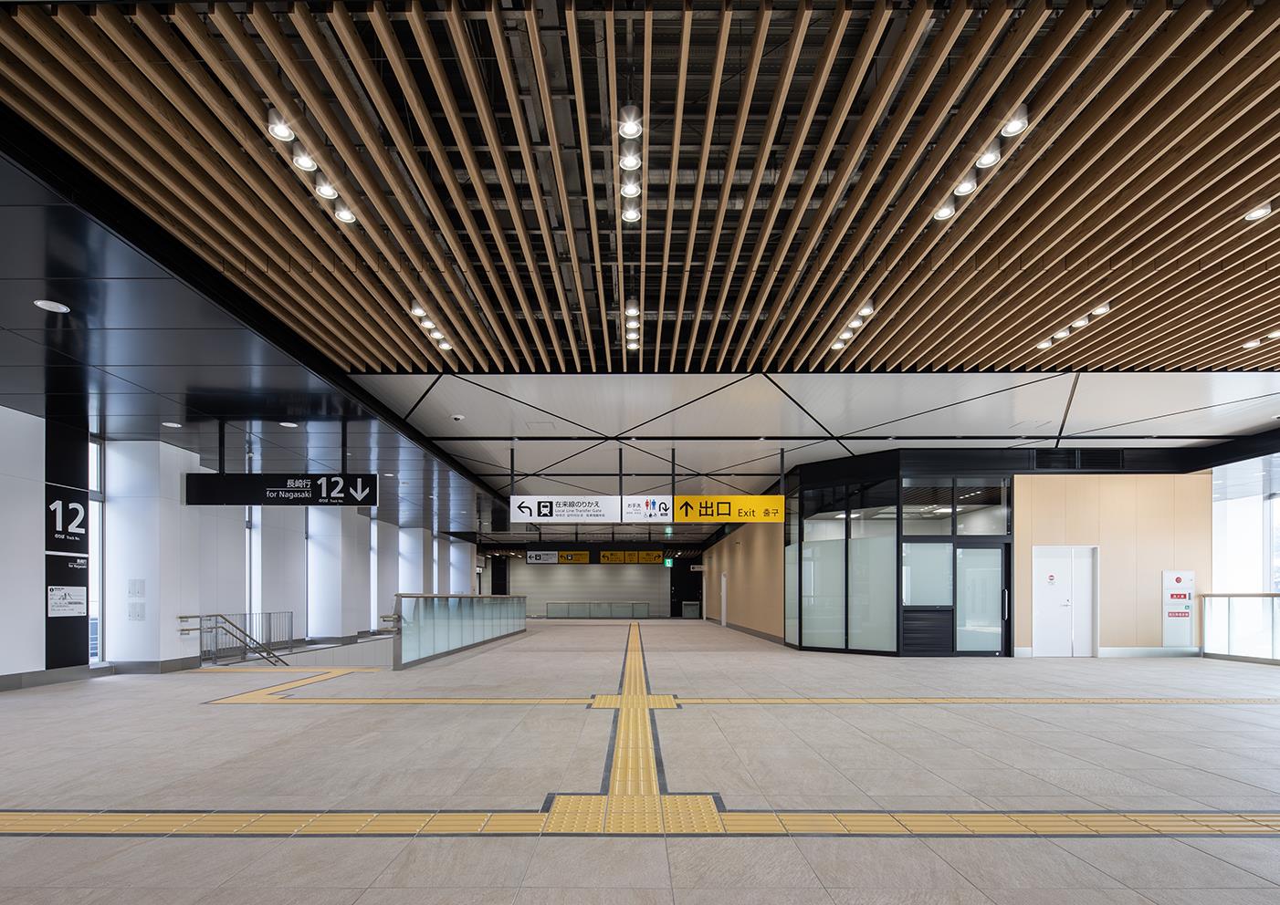 外観デザインは諫早の明るい未来を感じるゲートをテーマにしつつ、二柱式架構により橋上駅では困難だった明るく見通しの良いホーム空間を実現した。地元の文化や素材をデザインの要素として取り入れながら、市民協働企画による押し花アートを使ったガラススクリーンの制作や福祉団体とのUD意見交換会の開催により地域に愛される駅を目指した。