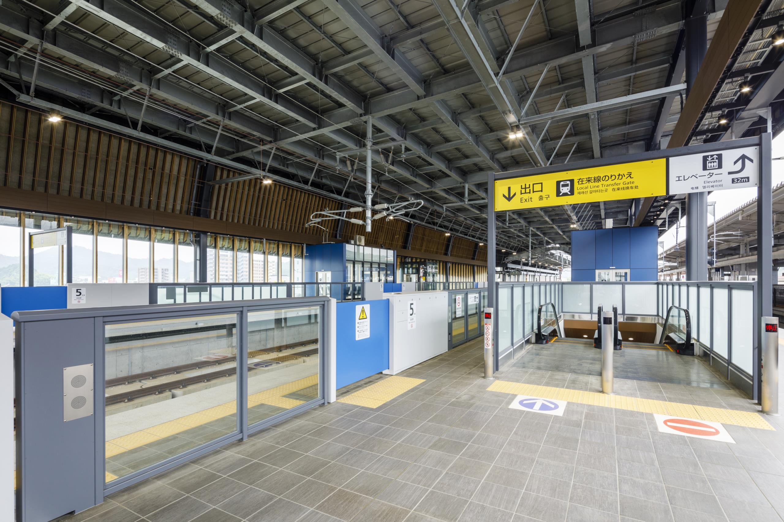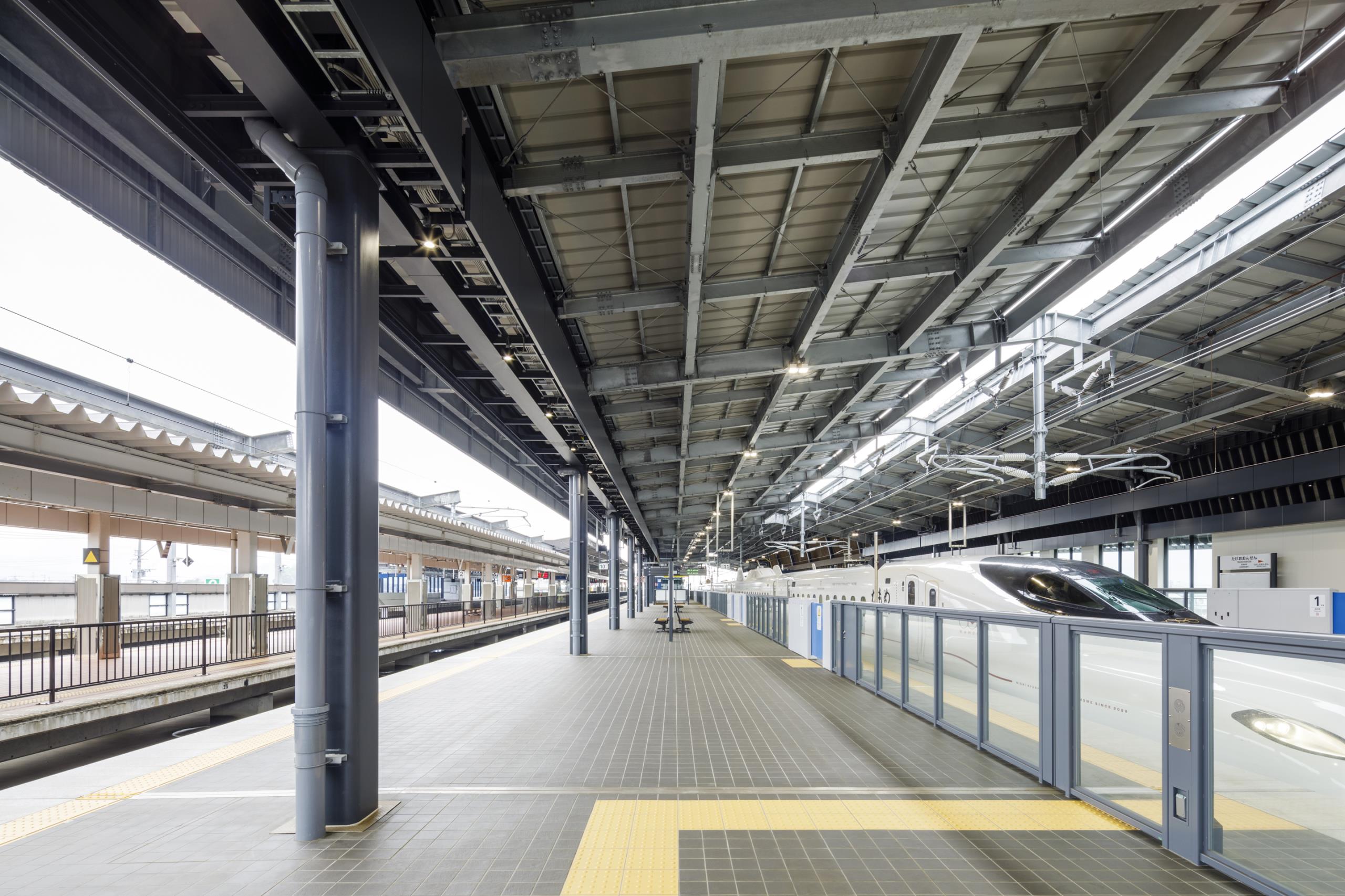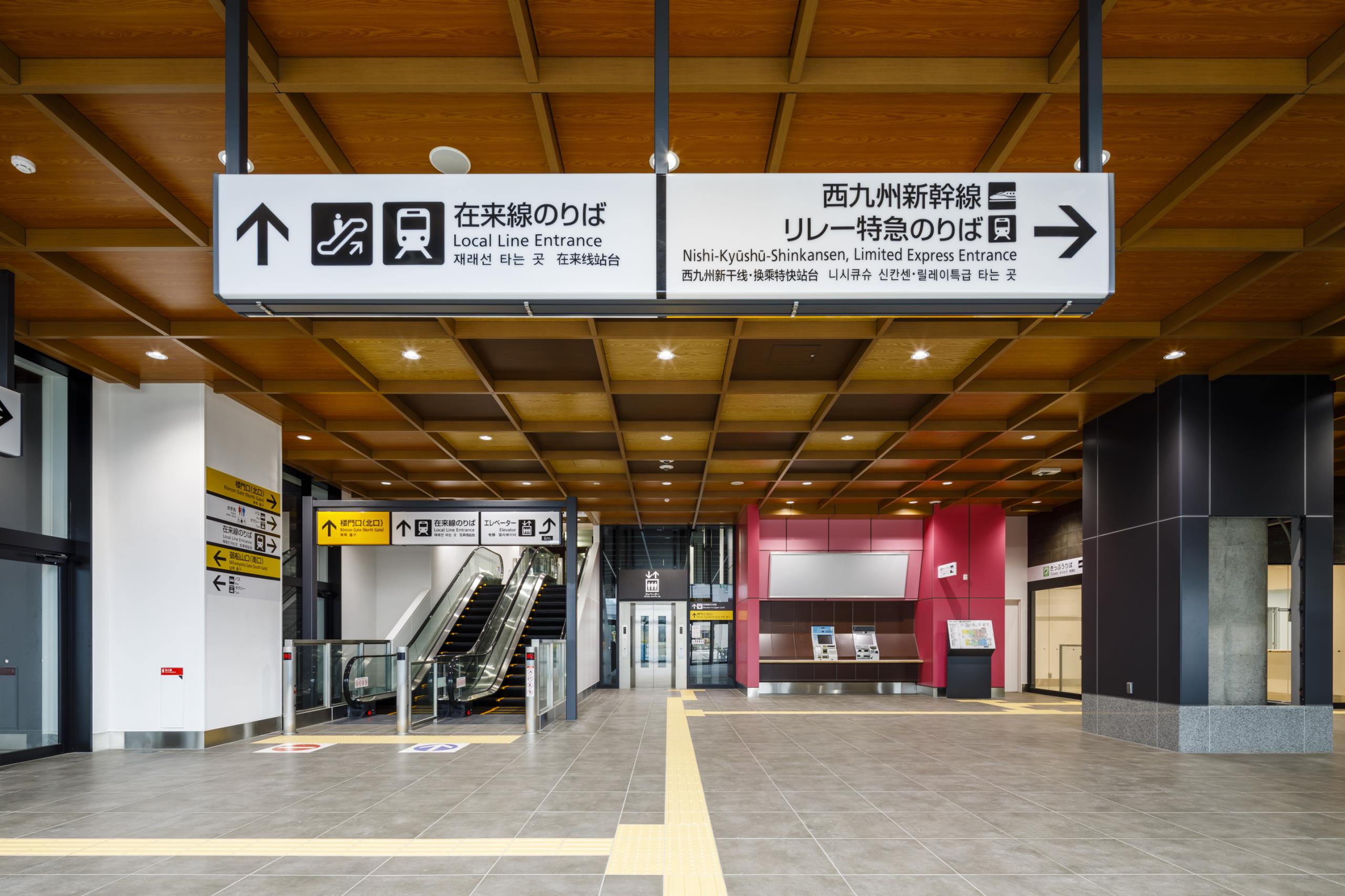 大屋根のホーム内側に地元産木材を活用し、コンコースは格天井を採用するなど和をイメージするデザインとした。設計にあたっては福祉団体とのUD意見交換会を開催するなど、地域に愛される駅を目指した。
