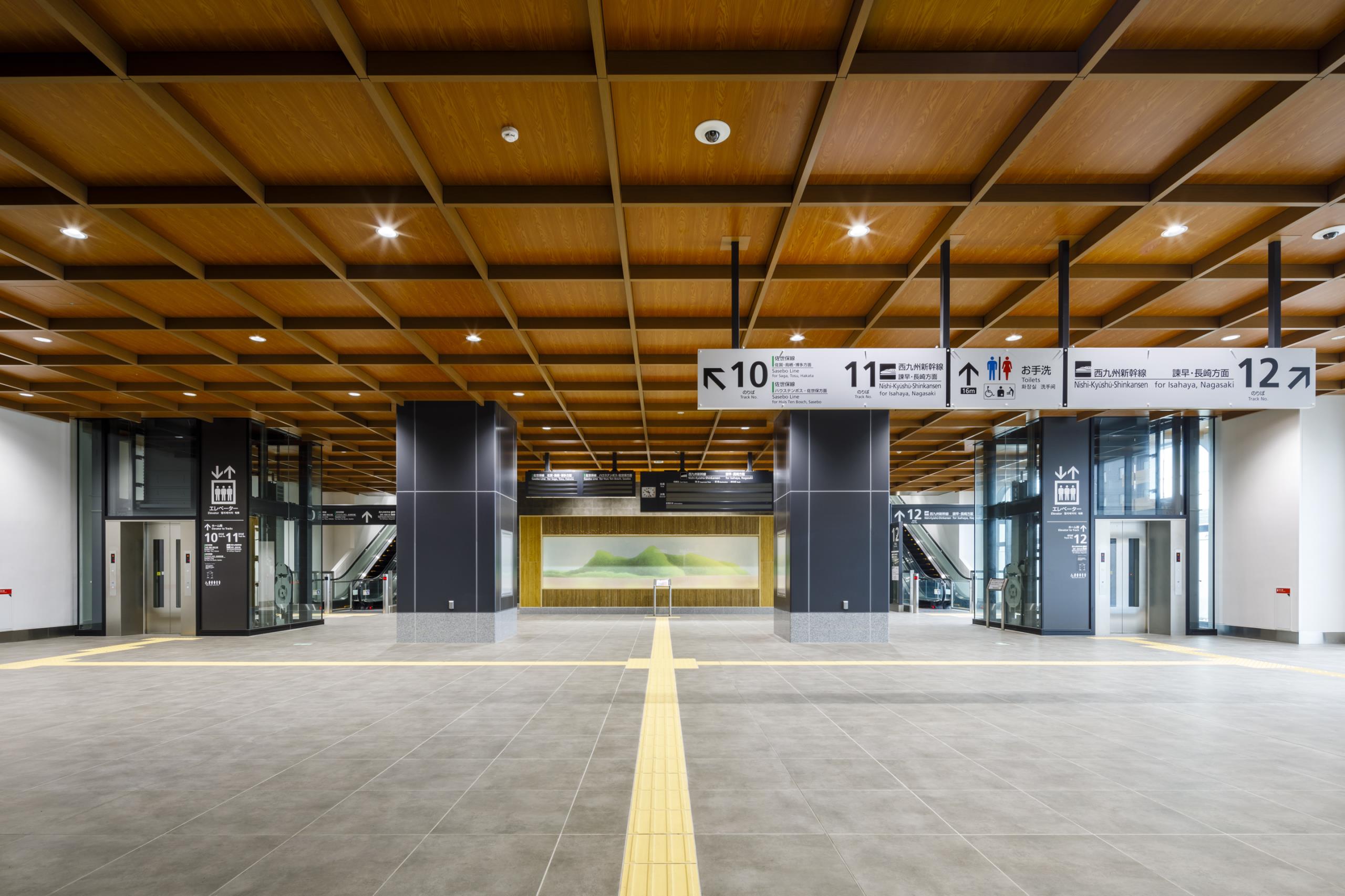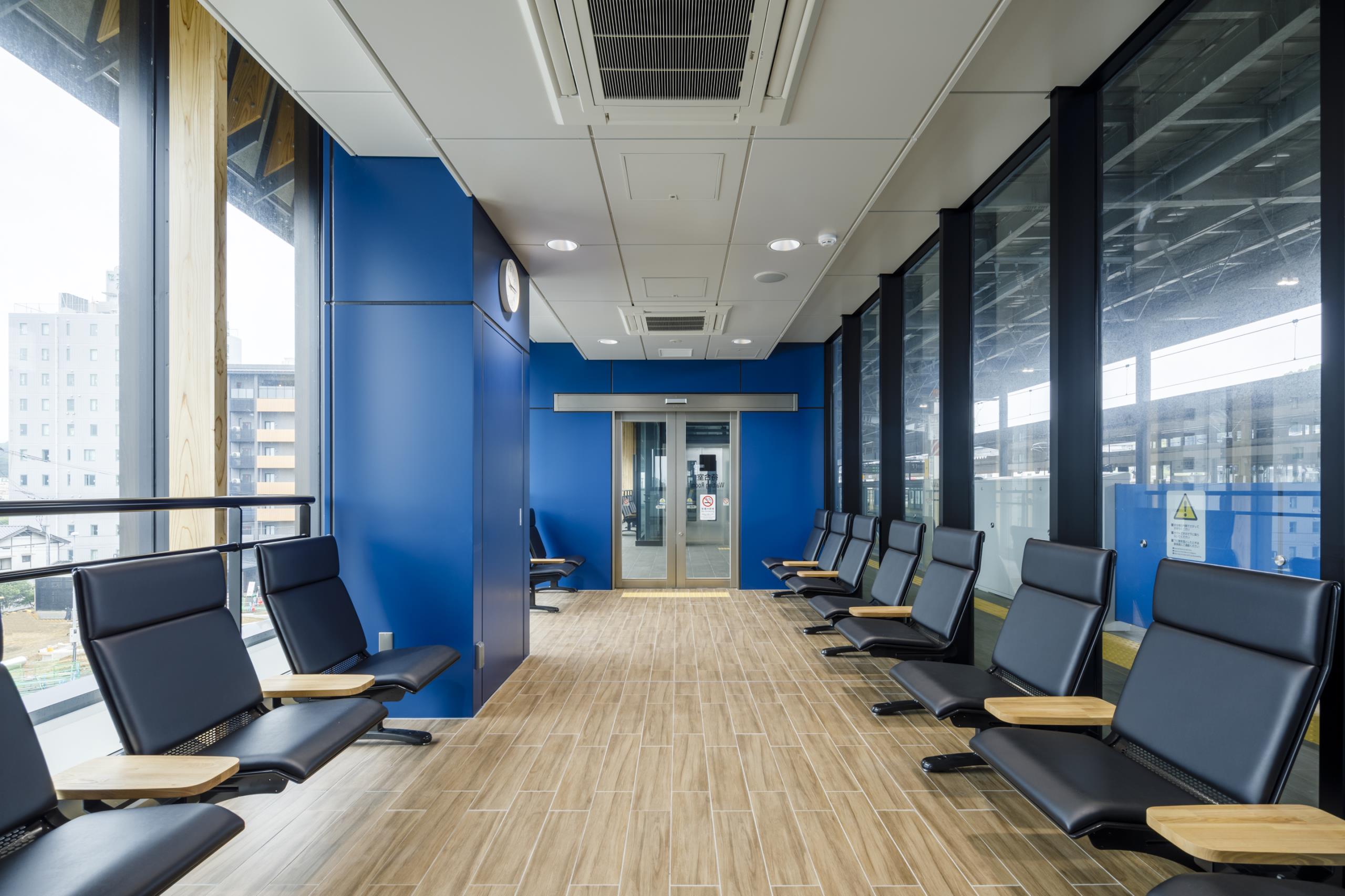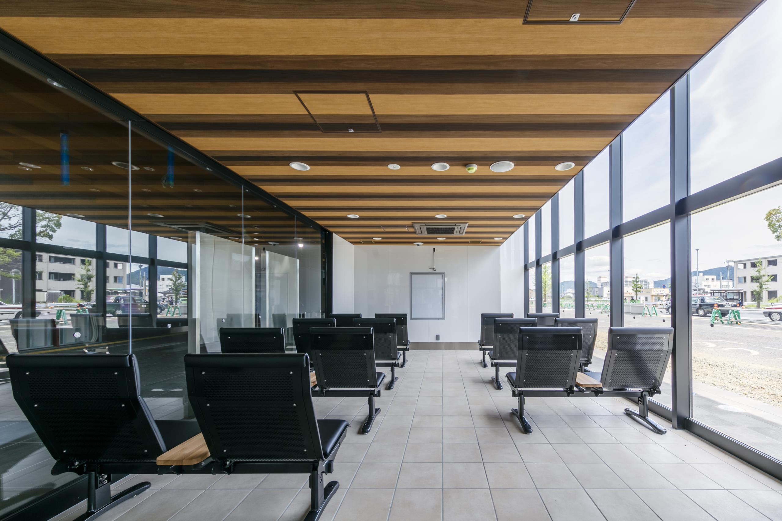 大屋根のホーム内側に地元産木材を活用し、コンコースは格天井を採用するなど和をイメージするデザインとした。設計にあたっては福祉団体とのUD意見交換会を開催するなど、地域に愛される駅を目指した。