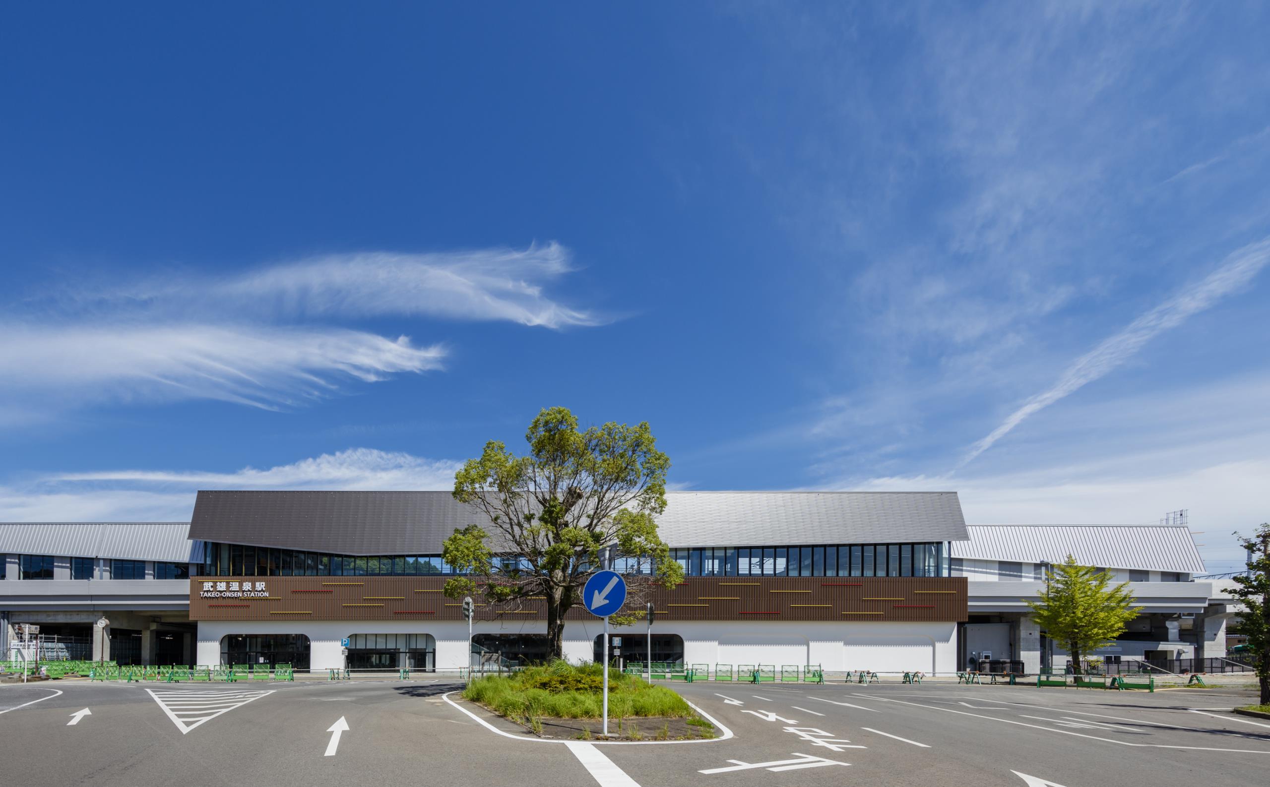 武雄の温泉街になじむよう、駅本屋の低層部を漆喰や赤い木組をイメージした外装とし、ダイナミックな大屋根をかけ現代的な表現とした。