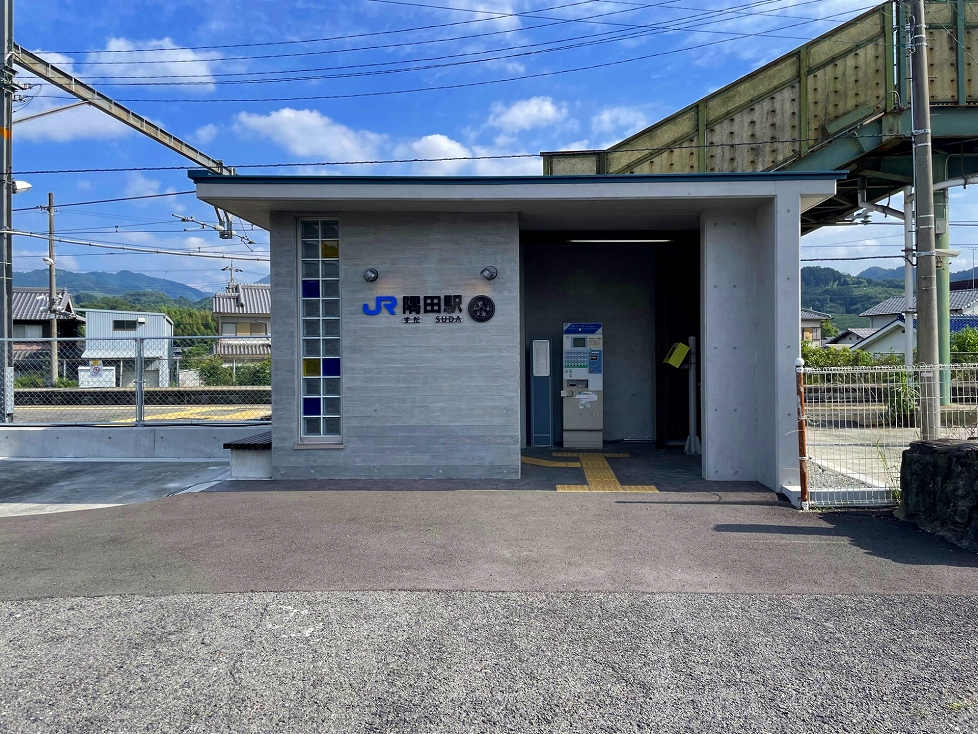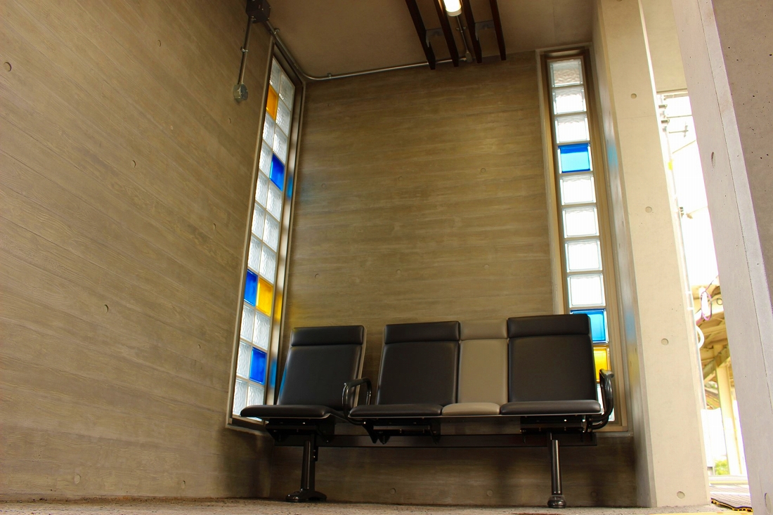 地元中学生によってイラストが描かれた特徴ある旧駅舎の老朽化に伴い、ご利用に則したシンプルな駅舎へ建て替えを行いました。地域に愛される駅舎へ込められた想いを継承すべく、ガラスブロックの明かり取りや木目調の仕上げ、新たな駅のモチーフの設置により、小規模ながらも新しい地域の顔となる駅舎となることを目指しました。