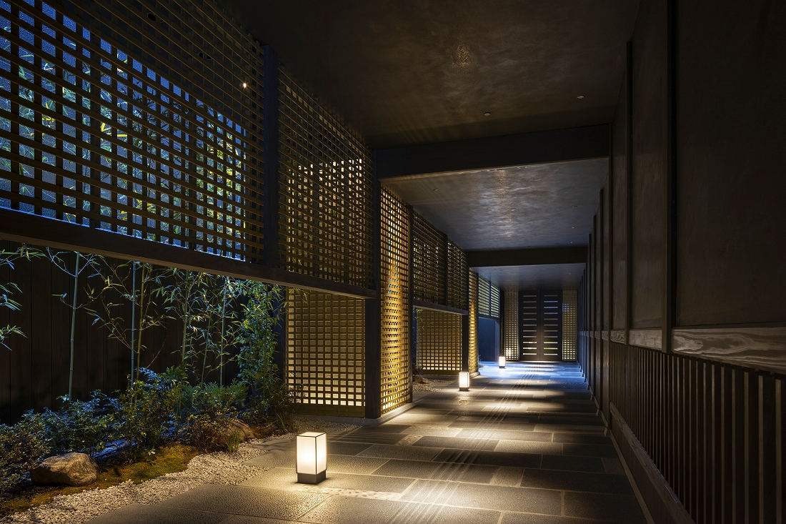 京都ならではの間口の狭い敷地を活かし、玄関から通り庭を経てロビーまで導くことで京都ならではの町屋の空間を表現した。