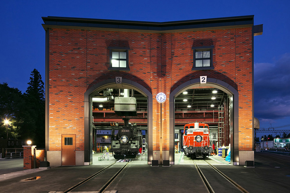 下今市SL機関庫は、SLおよびDLを格納し日常点検等を行うため、内部にはクレーンおよび排煙装置を有している。外観は近代化産業遺産として相応しい赤レンガタイル貼りでレトロな雰囲気を表現しており、同時整備した転車台広場とも接することから、SLおよびDLの点検風景を間近で楽しんでいただけるよう大きなガラス張りの面を設けた。単なる格納庫としての機能のみならず、観光目的で訪れてみたくなる鉄道施設を目指している。なお、外壁の赤レンガタイルを焼くにあたっては、各地の釜の検討を行い、愛知県瀬戸市の工場を選定し特注している。