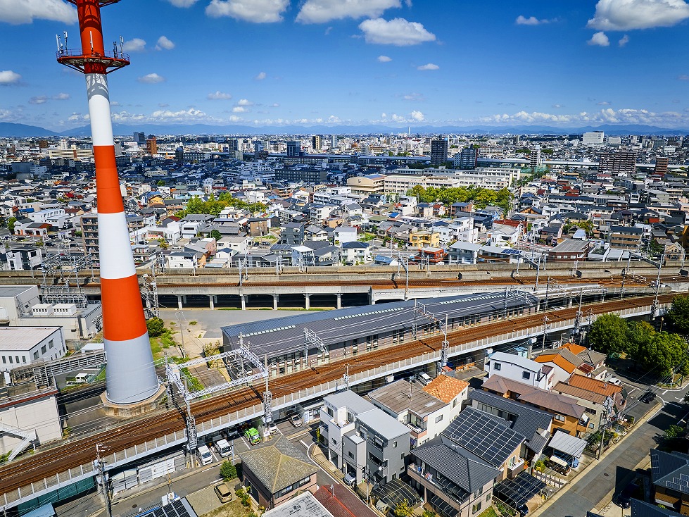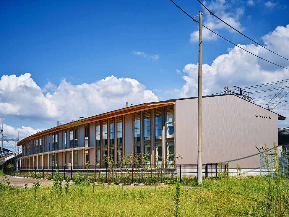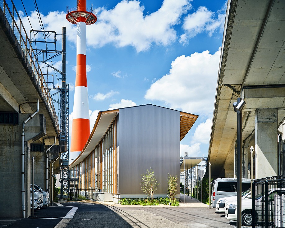 敷地は東西を高架に塞がれた袋小路になっている。名古屋駅からは電車で 5 分と好立地ながら、工事用の資材置き場となっていた、茫漠とした都市インフラによるデッドスペースとも言える空間に、新たに木造二階建てのオフィスを建てることで、人の居場所を都市の裏につくりだすことを意図している。