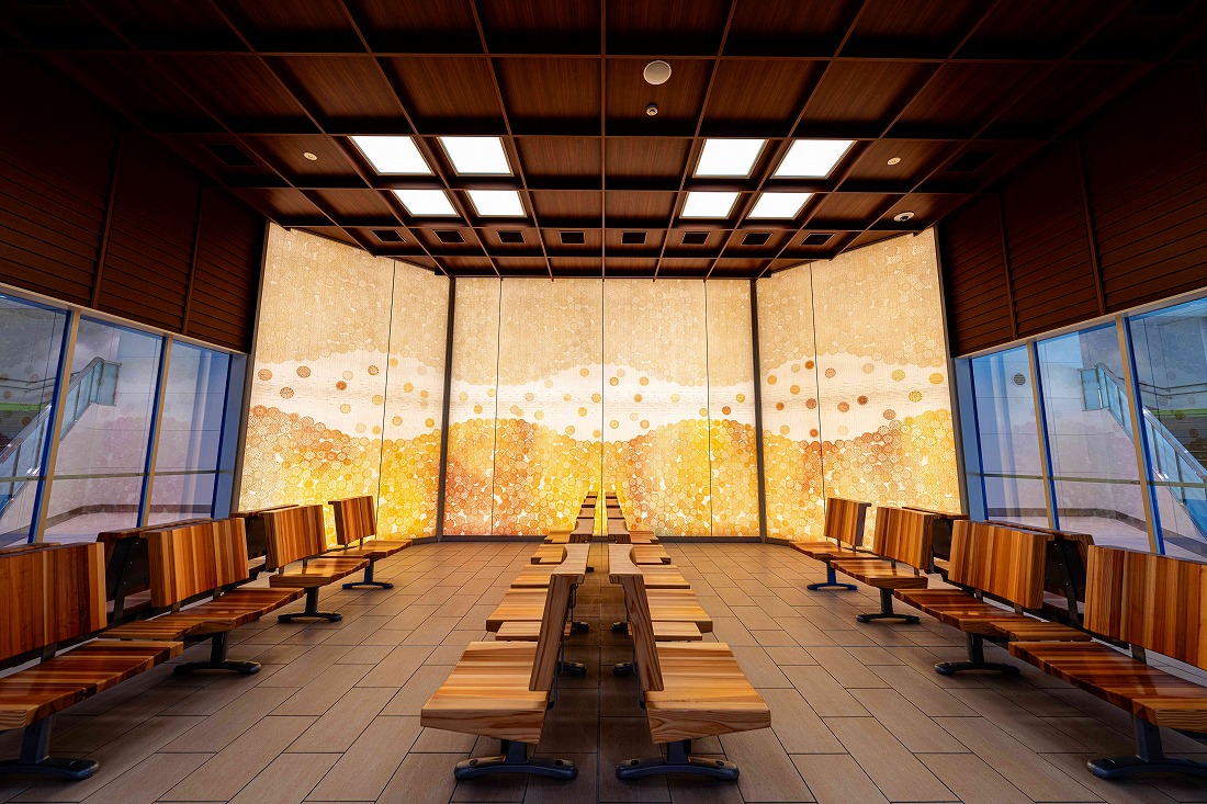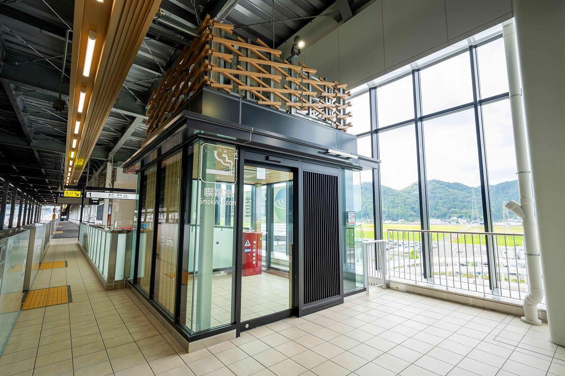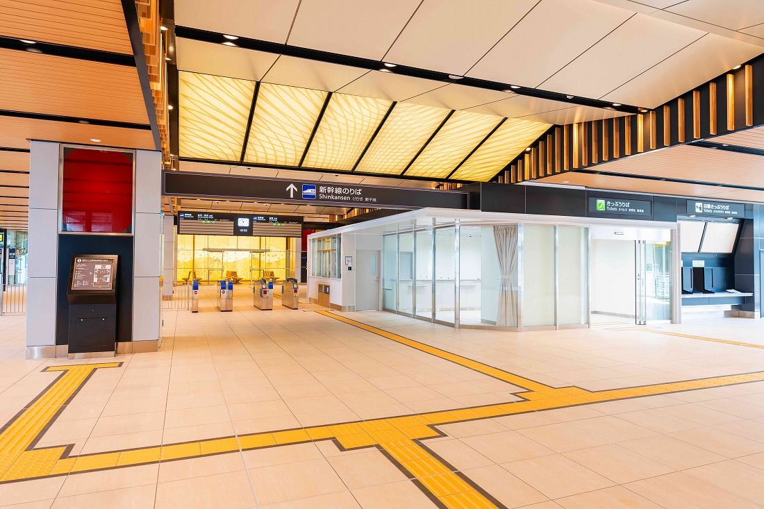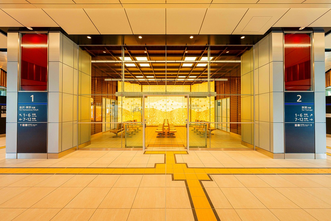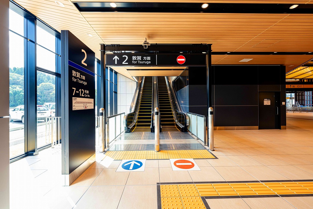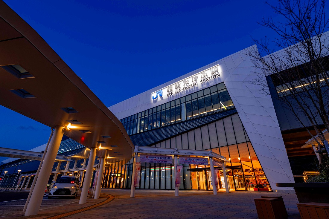 金沢・敦賀間で唯一の「在来駅に併設しない新設駅」である越前たけふ駅は、周辺施設との利便性向上に配慮した平面計画を行っている。コウノトリをモチーフにした外観に加え、外壁に越前瓦や内部に越前和紙や越前指物の伝統工芸品を活用、越前刃物や越前漆器をイメージした内装材の活用など、美しい自然環境と伝統や文化を感じられる駅とした。