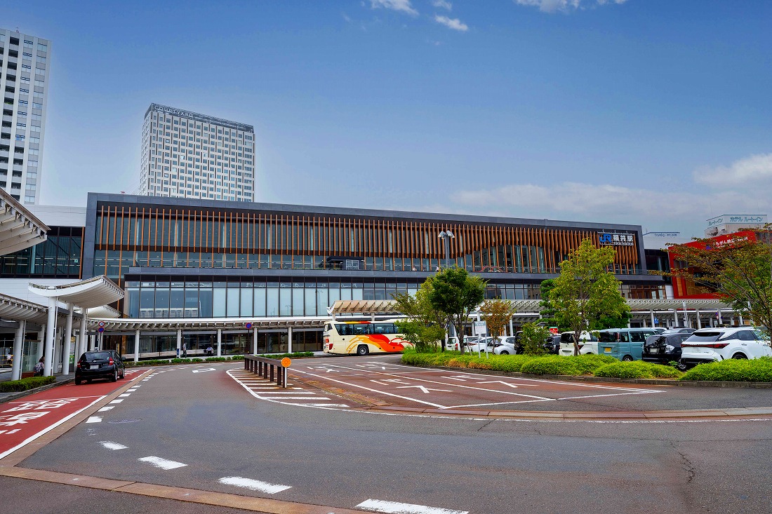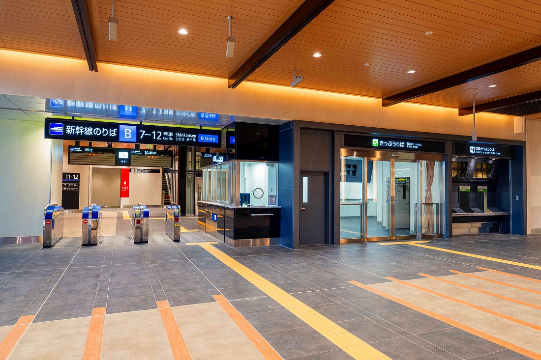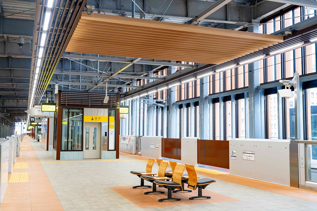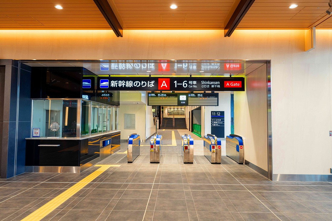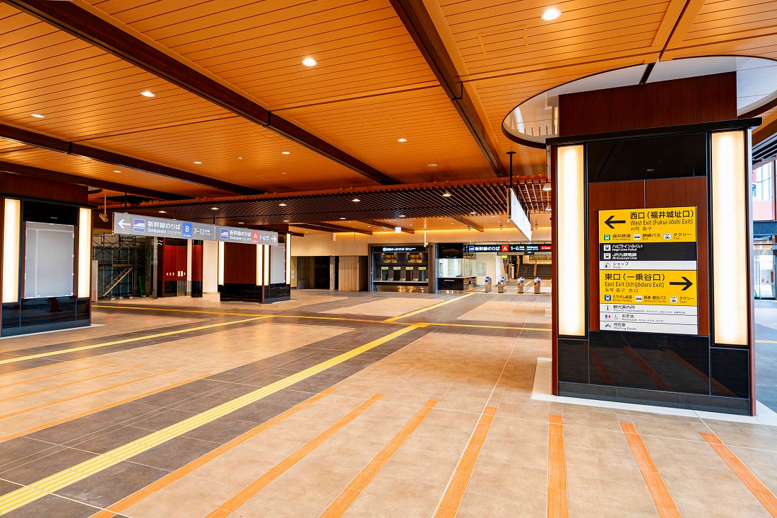 福井駅は交通結節点としての役割を担うべく、在来線との乗換え利便性や東側の都市施設、新幹線、西側の在来線までの旅客動線の連続化に注力し整備した。外観は福井の歴史を感じさせる唐門をモチーフとしたシンボルゲートをイメージし、内観は県産木材や越前和紙に併せ、福井の文化や歴史を象徴する笏⾕⽯を活用し、重厚な和の空間を表現した。