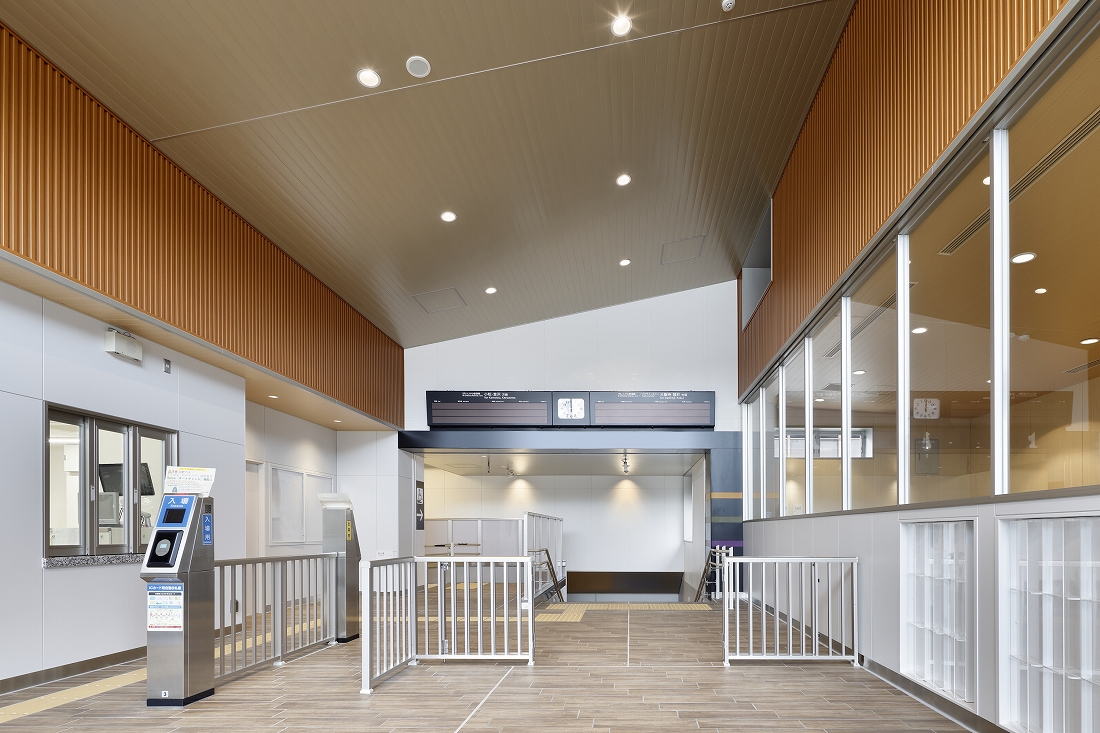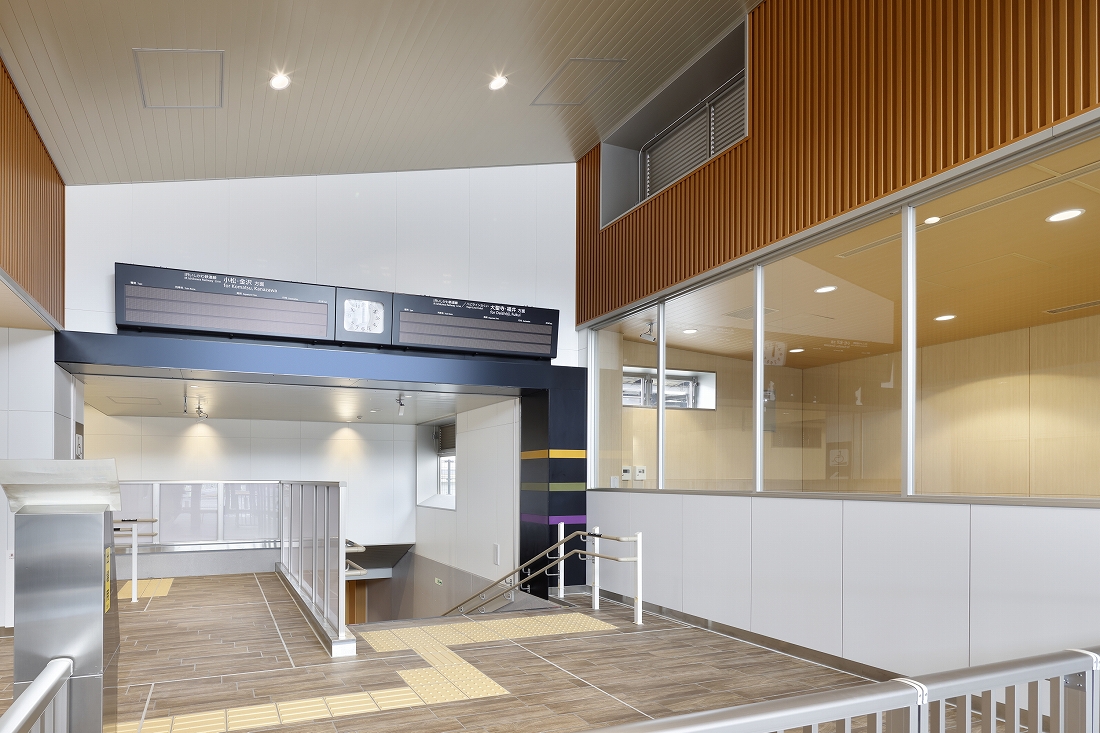 新幹線駅舎の新設に伴う既存駅舎の支障移転として、「加賀の趣を継承し、あでやかさ漂う駅」をコンセプトに新設した。新幹線駅舎との外観の調和を図りつつ、地元の方々にも愛着を持ってもらえる駅となるよう、加賀の伝統建築に用いられる「紅殻格子」「赤瓦」のモチーフや、橋立集落を想起させる勾配屋根を外装デザインに取り入れた。