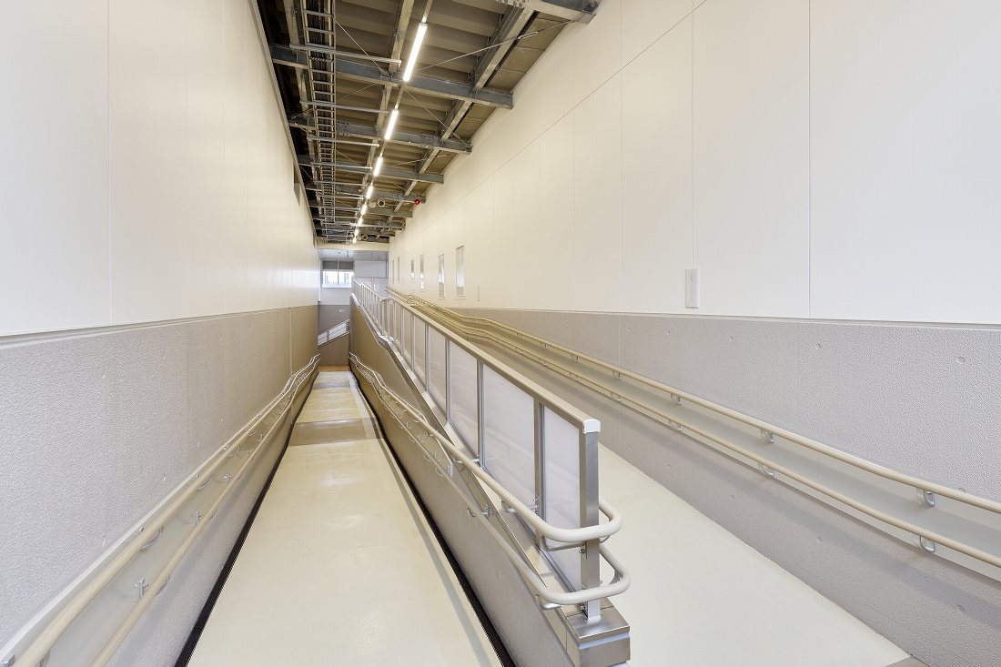 • 特徴的な仕上げ材屋根:カラーガルバリウム鋼板t0.4 / 外壁:押出成型セメント板 / 天井:アルミロールスパンドレル13mm t0.6 / 壁:化粧ケイカル板t6.0 / 床:磁器質タイル