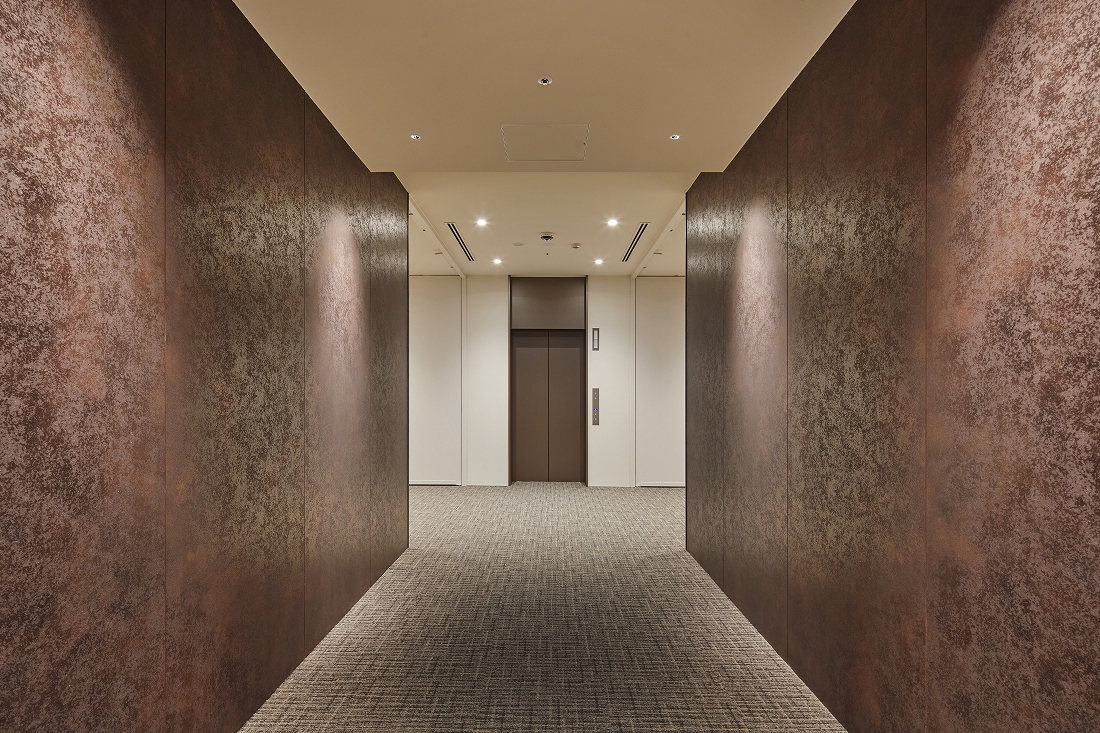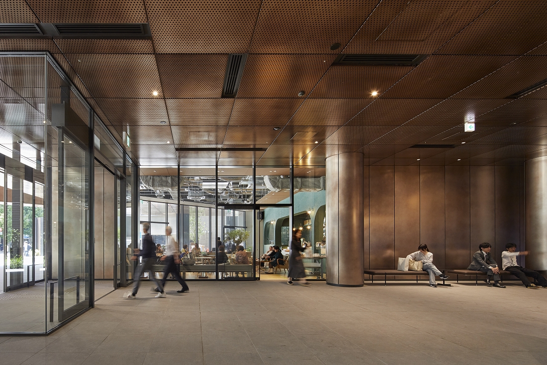 - 特徴的な仕上げ材外壁:YKKAP;アルポリックパネル / 建具:LIXIL;カーテンウォール / 天井:アルミパネル切板(有孔)特殊仕上げ / 壁:福岡県産材(杉)ルーバー / 床:名古屋モザイク;磁器質タイル