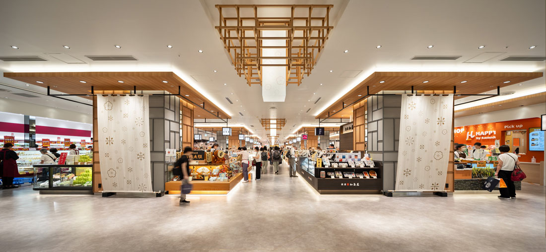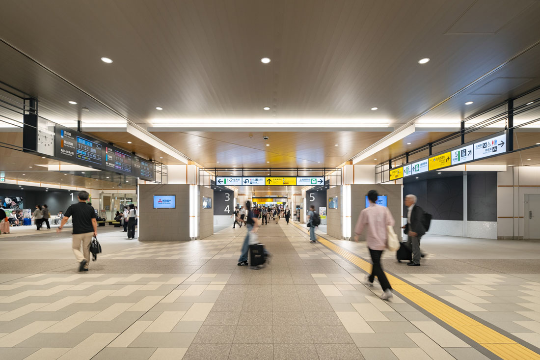 • 特徴的な仕上げ材屋根:三晃金属工業;二重折板(ガルバリウム鋼板フッ素樹脂塗装)/太陽工業;トップライト:膜屋根(四フッ化エチレン樹脂コーティングガラス繊維布)/外壁:【軌道階】ナガオカサッシ工業:スチール製マリオンフッ素樹脂塗装、アルミカーテンウォールフッ素樹脂塗装/【1・2階】石本金属:フッ素樹脂塗装鋼板、ノザワ:押出成形セメント板、名古屋モザイク:ノール/建具:ナガオカサッシ工業:アルミサッシ(カーテンウォール/ フロントサッシ)/天井:理研軽金属工業:アルミスパンドレル、チニモクファンシーマテリアル:アルミスパンドレル不燃木練付/アサヒ金属:ガルバリウム鋼板トップマコート:3Dステンレスパネル水明/壁:アイカ工業;化粧ケイカル(セラール)、ダイナワン:磁器質タイル/床:ダイナワン:磁器質タイル、いりやまと:花崗岩東リ及びサンゲツ:塩ビシート(防滑) ADVAN:磁器質タイル ファインストーン SUSバイブレーション・鏡面・HL t1.5