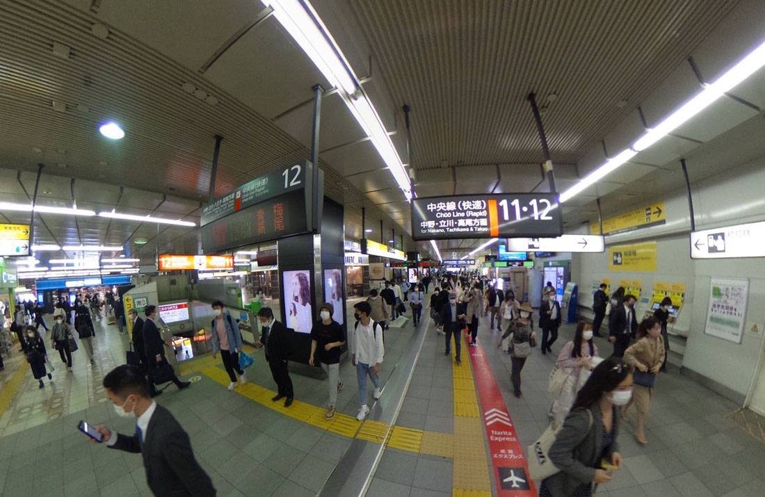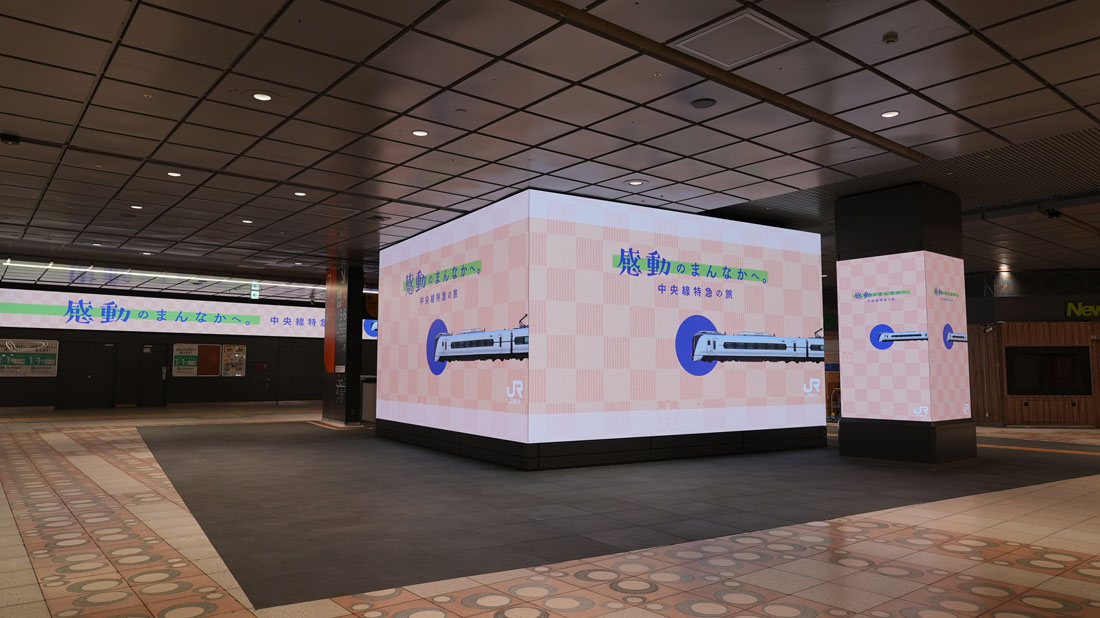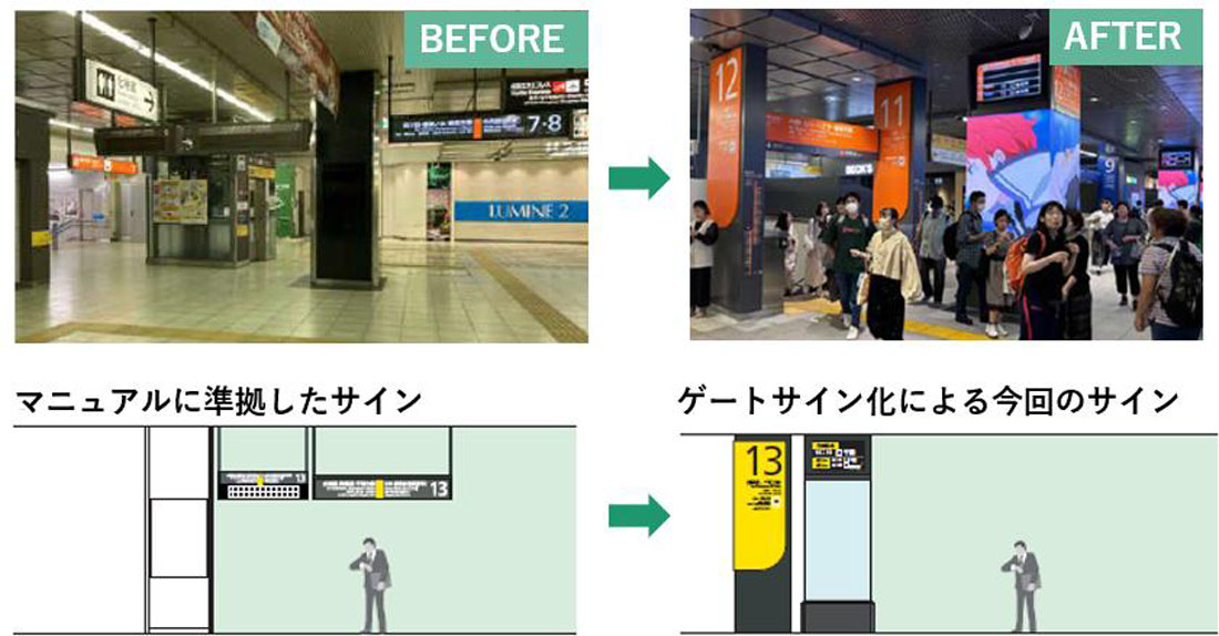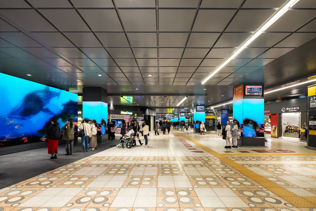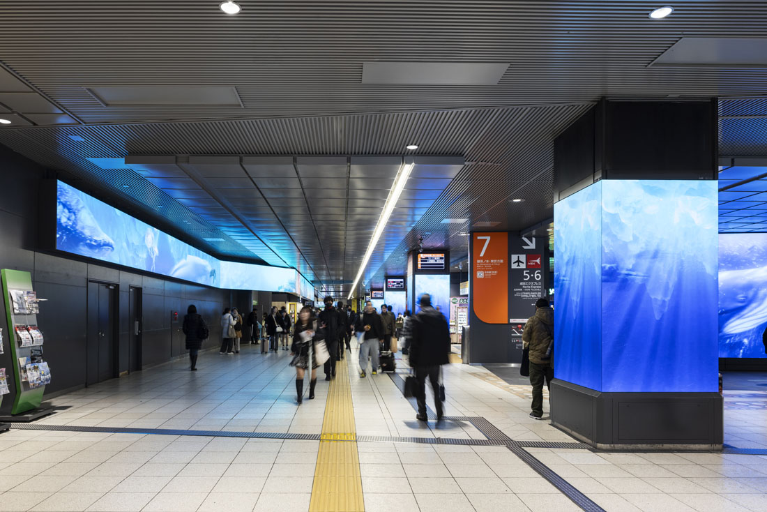 新宿駅南改札内コンコースのリニューアルでは、サインや広告、店舗のデザインを統一し、グレーを基調に空間を整理することで、情報が乱立し視認性が低かった空間を見通しの良い快適な環境へ改良した。駅構内に3つの特徴的な大型サイネージを設置することで、空間演出による没入体験が可能な新たな駅空間を創出した。