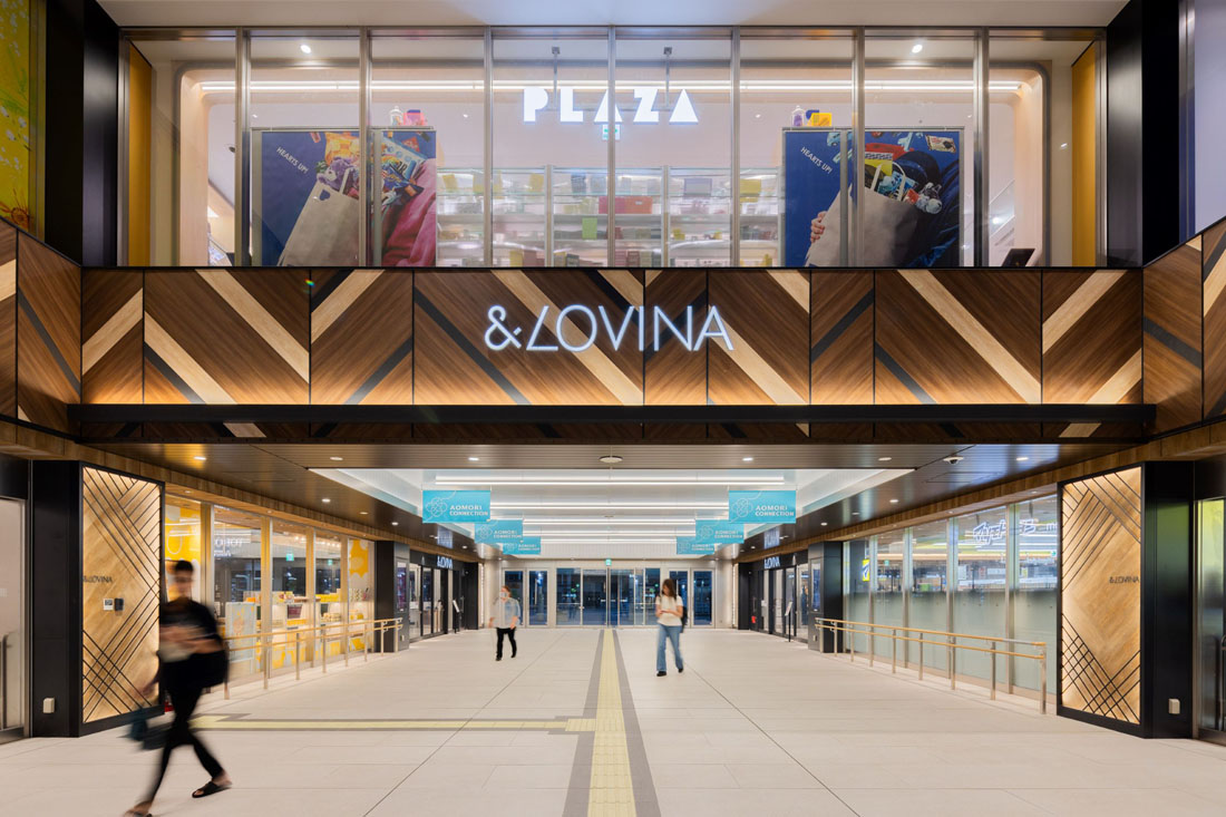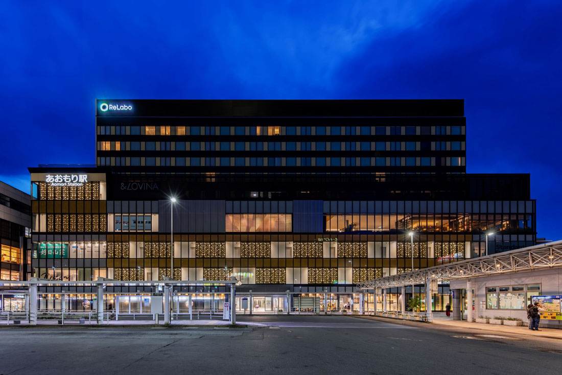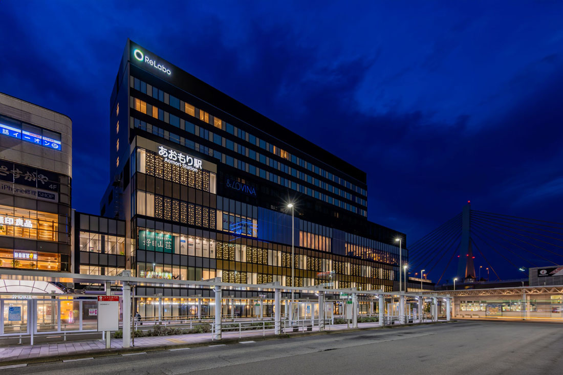 旧青森駅の敷地に新築されたJR青森駅東口ビルは、建物東面には青森の伝統的な「ねぶた」をモチーフに、県産ヒバ材の削孔した木パネルを不規則に配置し、夜間にはパネルの穴から光が漏れる演出を施した。旧駅舎時代に親しまれていた駅名標は平仮名表記を継承し、再び地元からも愛される新「あおもり駅」が生まれた。