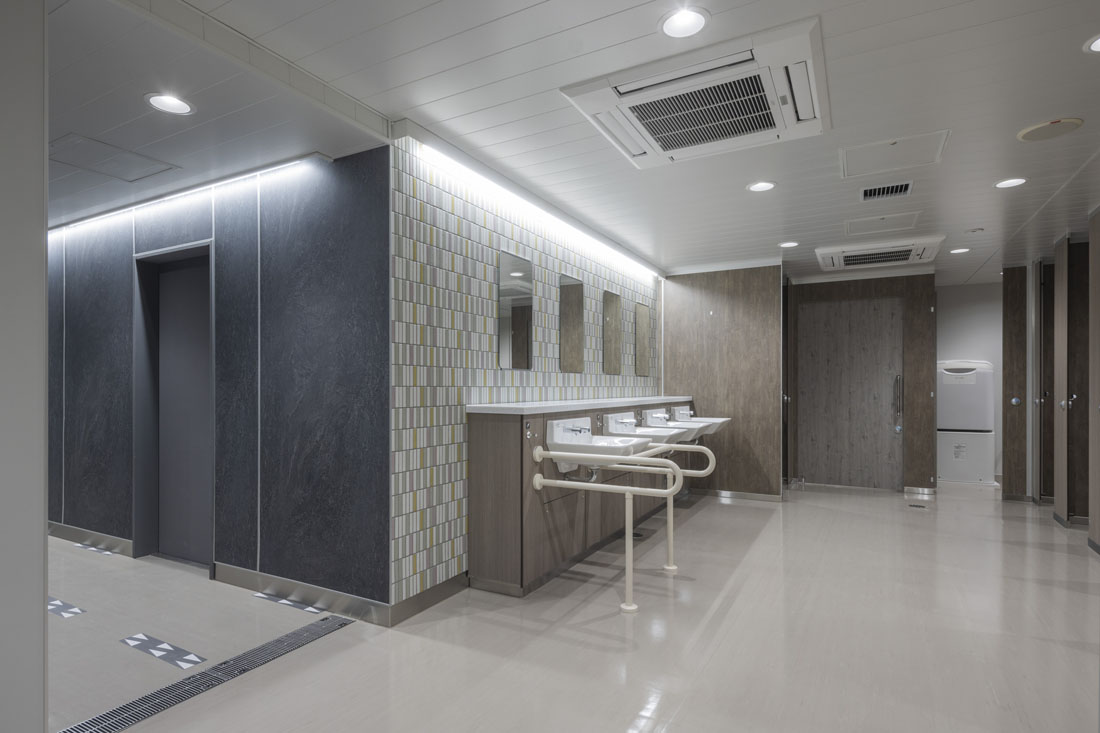 - 特徴的な仕上げ材天井:アルミスパンドレル アクリル樹脂エナメル焼付(流水システム天井)/壁:スチールパネルt1.6 フッ素樹脂焼付塗装/床:御影石400角 t30 テラタイル400角 t35