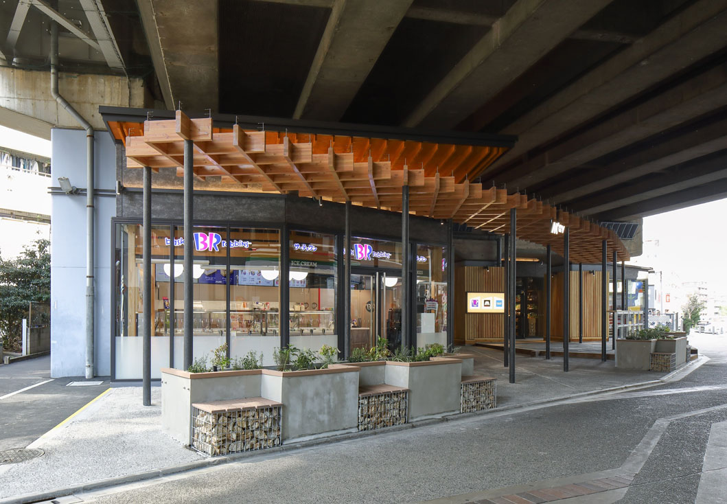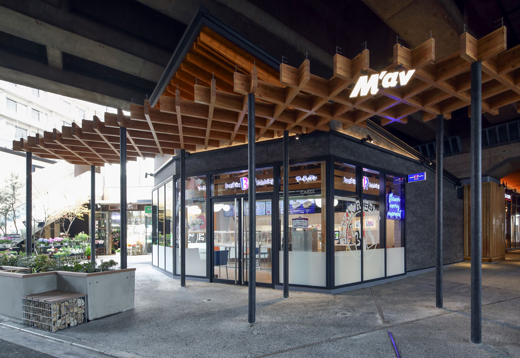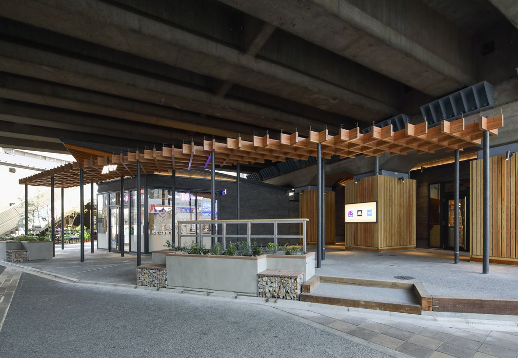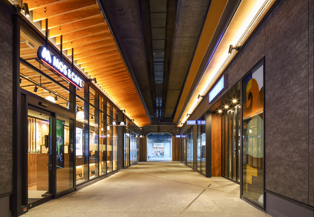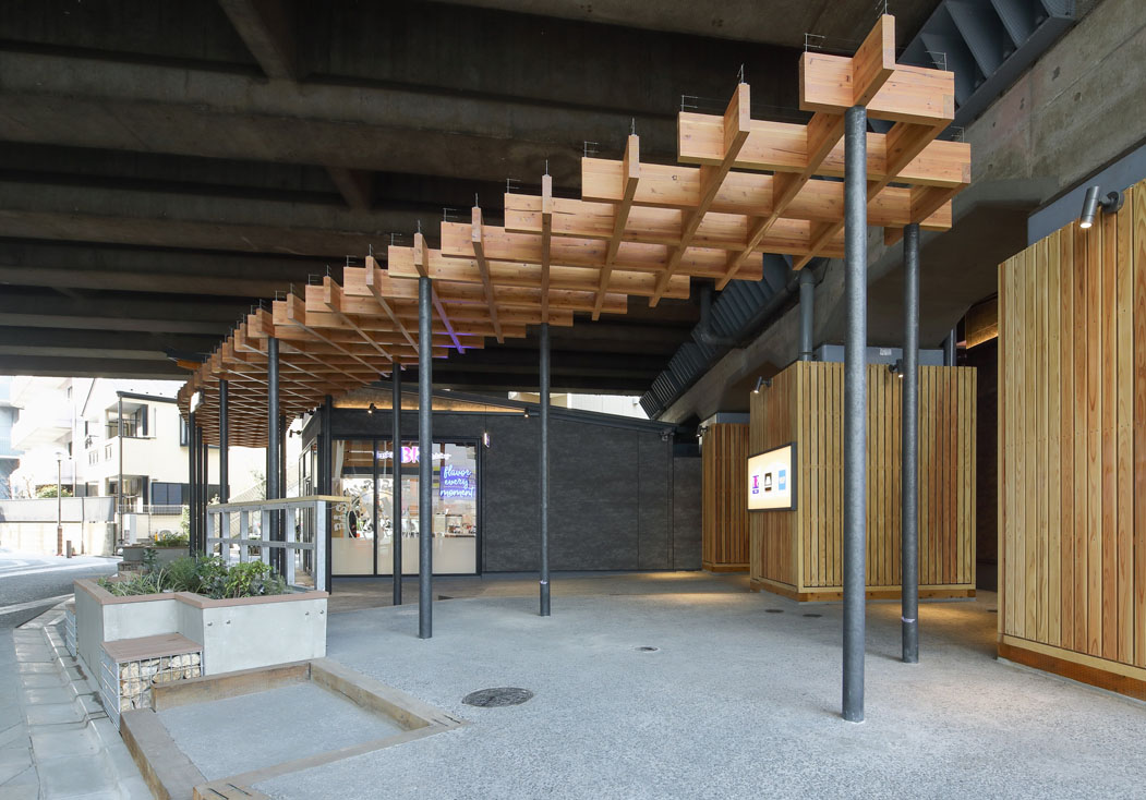 浦安駅の高架下商業施設で、平屋建ての木造と鉄骨造の2棟で構成。東京メトログループ初の木造建築。SDG'sや脱炭素化への取り組みとして木造を取り入れ、木の温かみを感じられる空間とした。東西線の駅や高架下が、まち、人、時間を”たすきがけ”につないでいく存在になっていくことを、クロスするデザインで表現している。