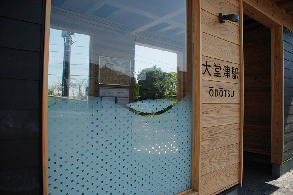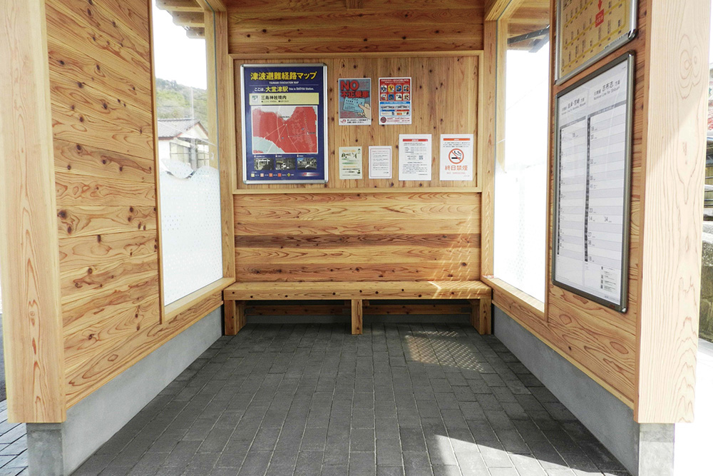 駅舎の老朽取替と設備のスリム化を目的とし、コンパクトな待合所への建替えを行った。デザインは日南線を走る観光列車「海幸山幸」の撮影スポットである橋梁をモチーフとし、構造体や内装材には宮崎県産の飫肥杉、床には宮崎県の活火山である新燃岳の火山灰を配合したレンガを使用する等、地域の素材を使い、地域に愛される駅を目指した。