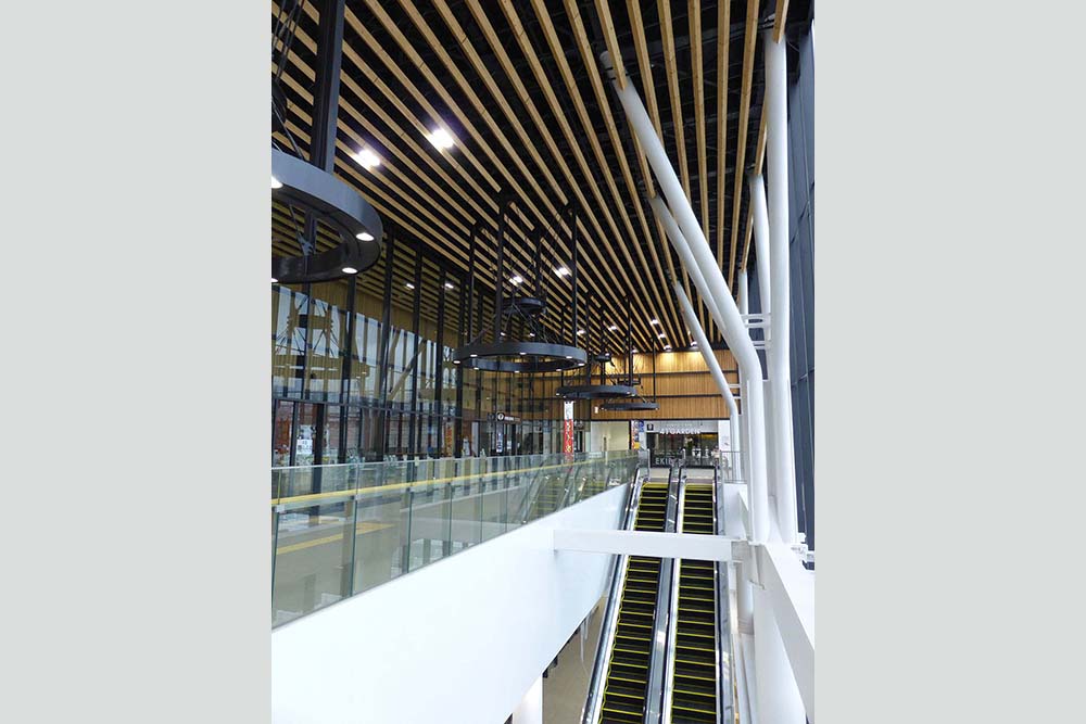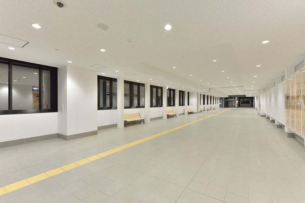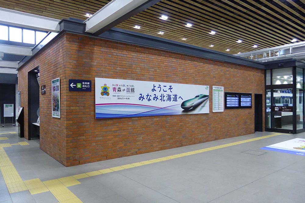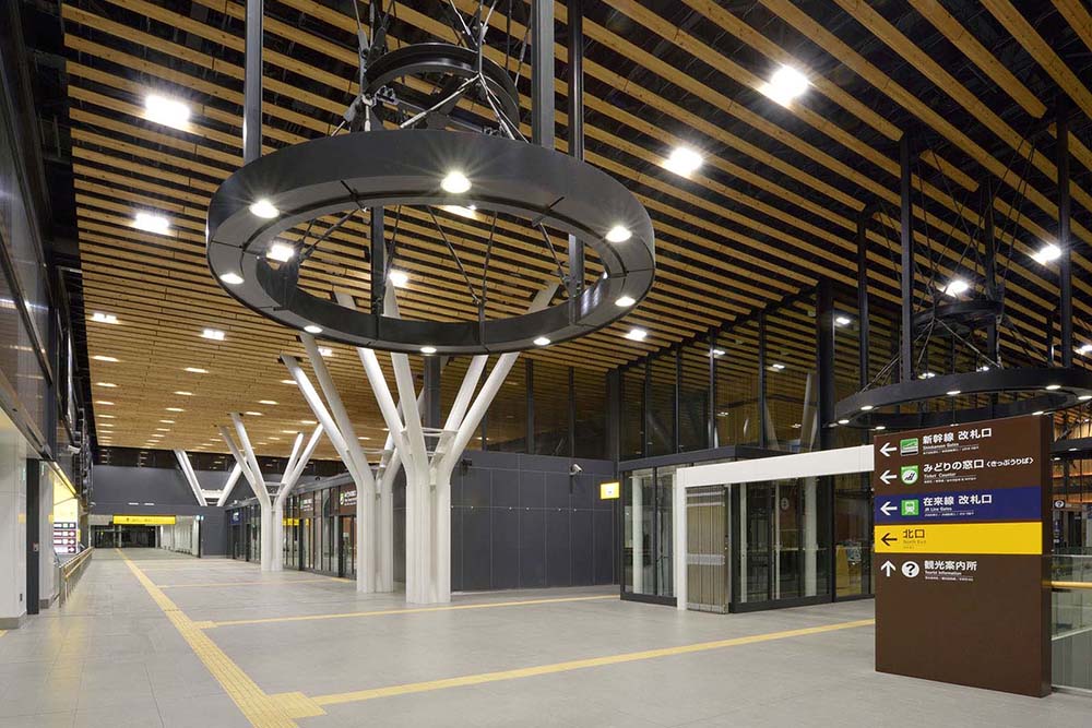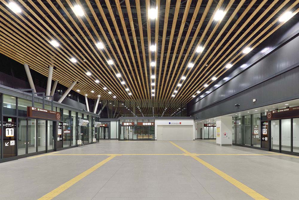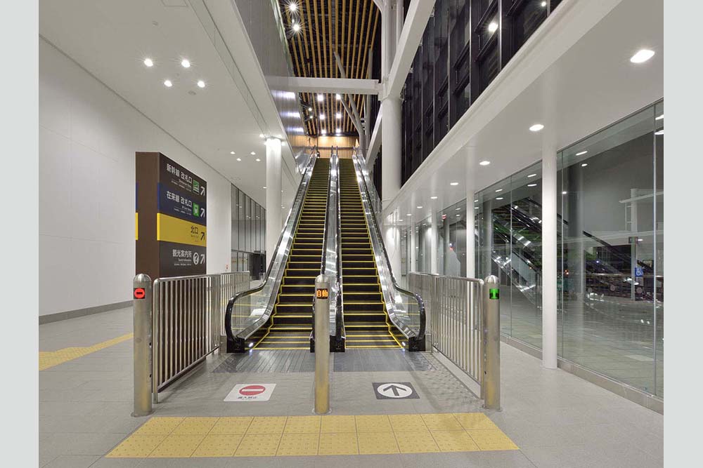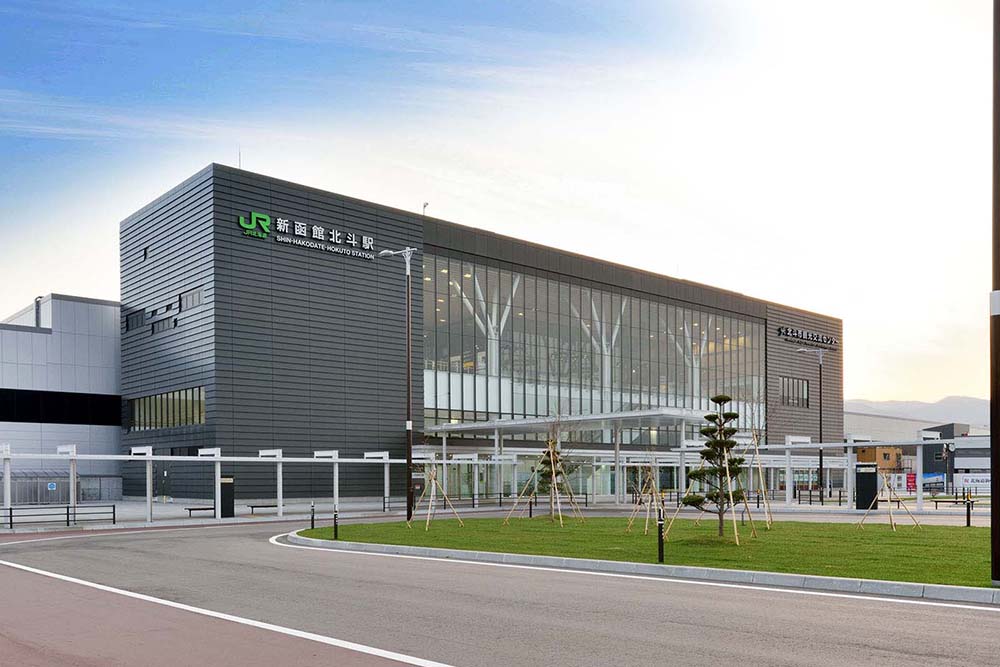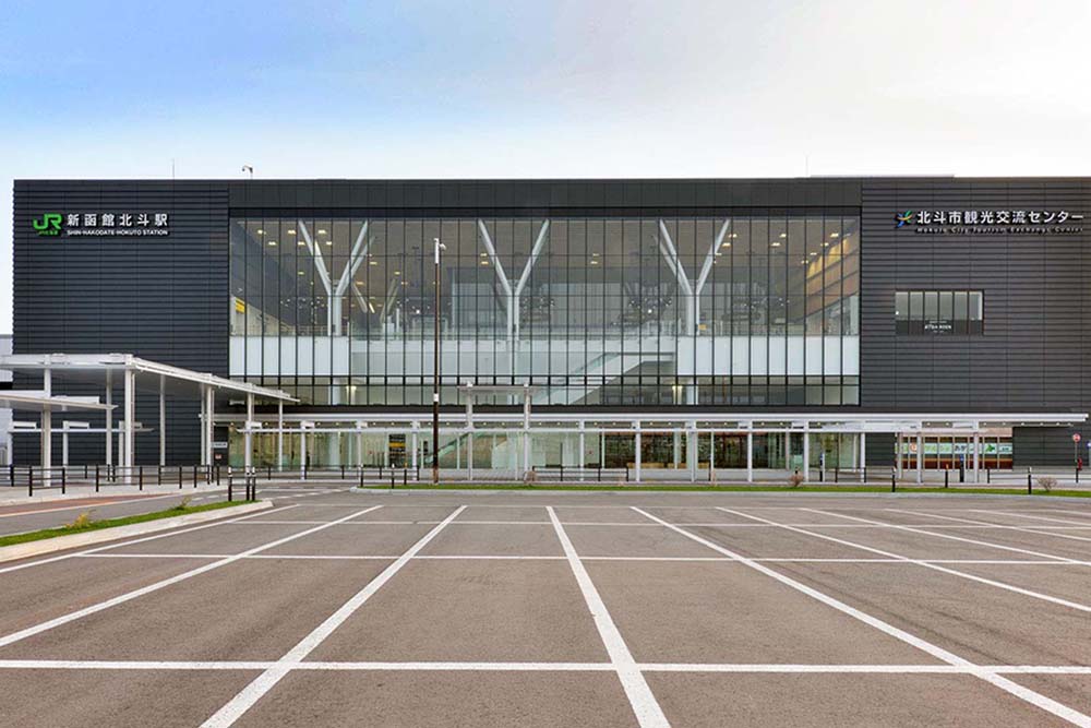 北海道新幹線新函館北斗駅は、新幹線と在来線が同一フロアで乗り換え可能な乗換改札口を持つ、地上3階建の橋上駅である。デザインコンセプトは「自然と呼吸(いき)するモダンで温かみのある駅」とし、駅の顔となる南口の大開口を通して四季の色彩や駅とまちの繋がりを見せるほか、道南杉の天井ルーバーやフランス積み煉瓦壁など地域素材の材料で温かみのある駅を表現している。