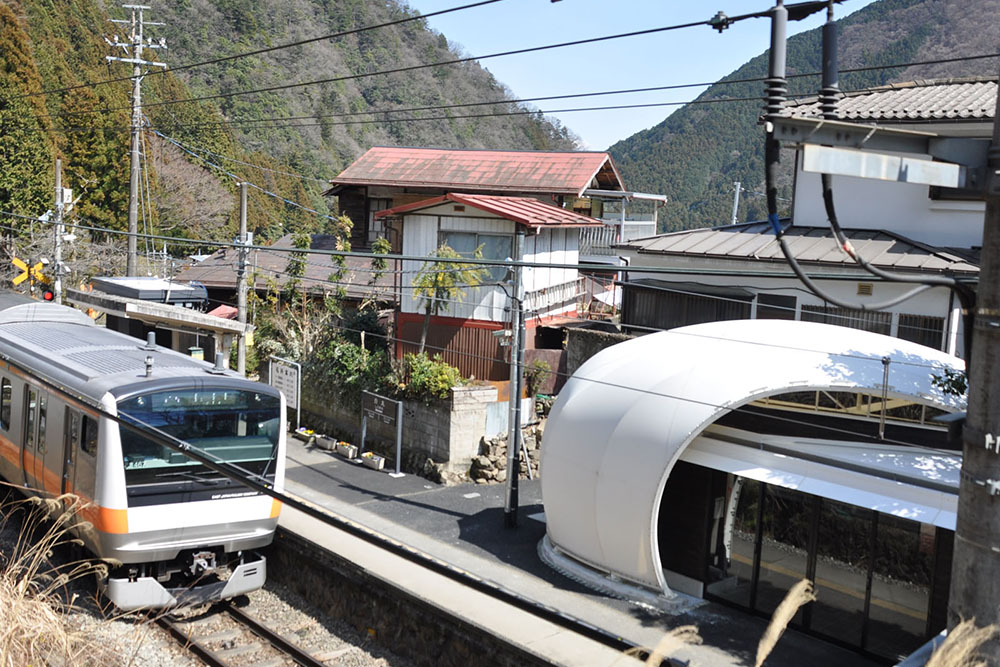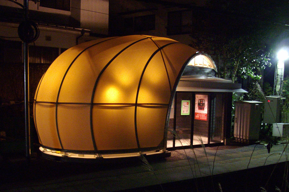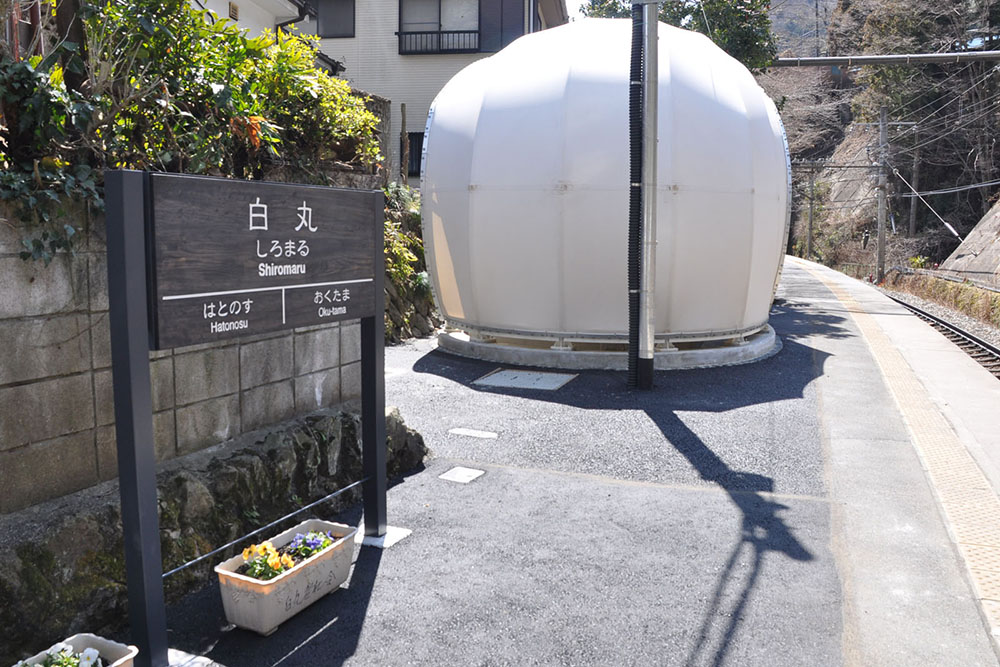 白丸駅は青梅線の終点から1つ手前にある無人駅です。待合室の中に有効に自然光を取り入れるため屋根及び外装仕上げとして膜材を用いました。膜で建物を上部から側面にかけて覆いこみ、外観を駅名どおりの白くて丸いシンボリックな形状にしました。また、夜間には膜を内側からライトアップすることで待合室全体がホーム上を照らす巨大な照明になるようにしました。鉄骨造ですが、周囲の自然との調和を考えて外壁には杉板材を用いています。杉板は黒に近いこげ茶で塗装し、膜の白さが際立つようにしました。