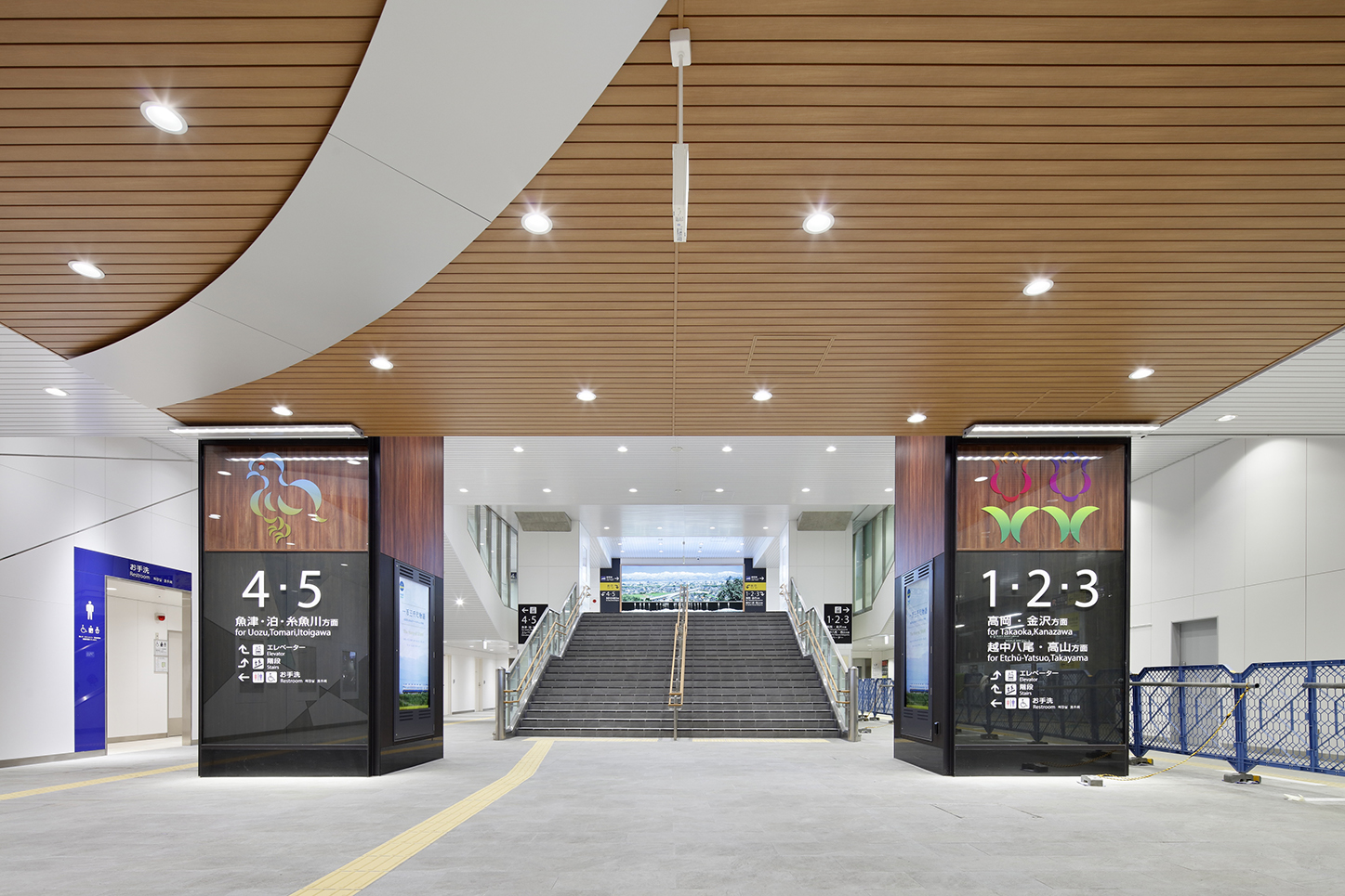 富山駅は自由通路およびLRT南北接続を含む連続立体交差事業の一環として高架化された。新幹線駅と共通の「立山あおぎ 心ときめく 光の舞台」をコンセプトに、縦ラインと白を基調としたファサード、立山杉に見立てた全覆い上家の柱を設えた。ホーム階はあいの風とやま鉄道線と新幹線との間に壁を設けないことで一体的な空間を構成した。
