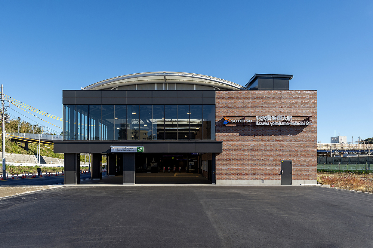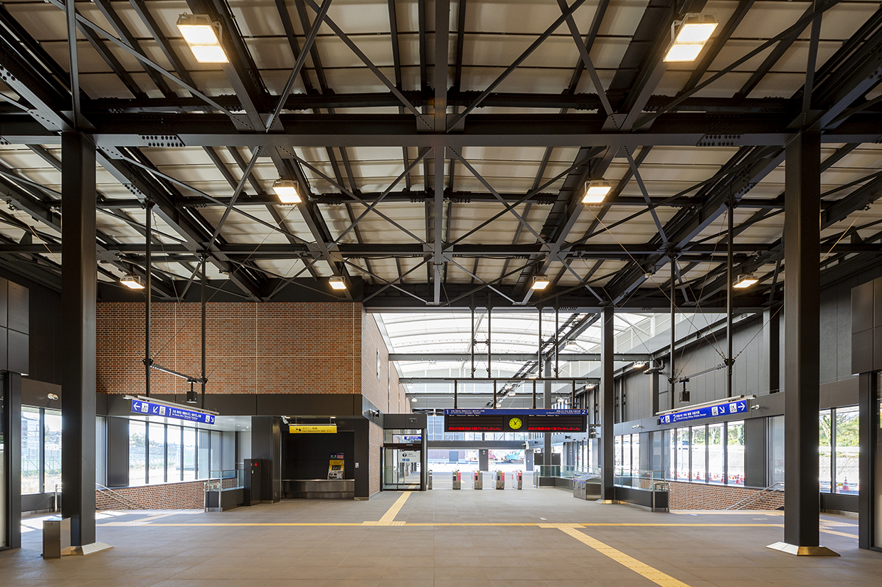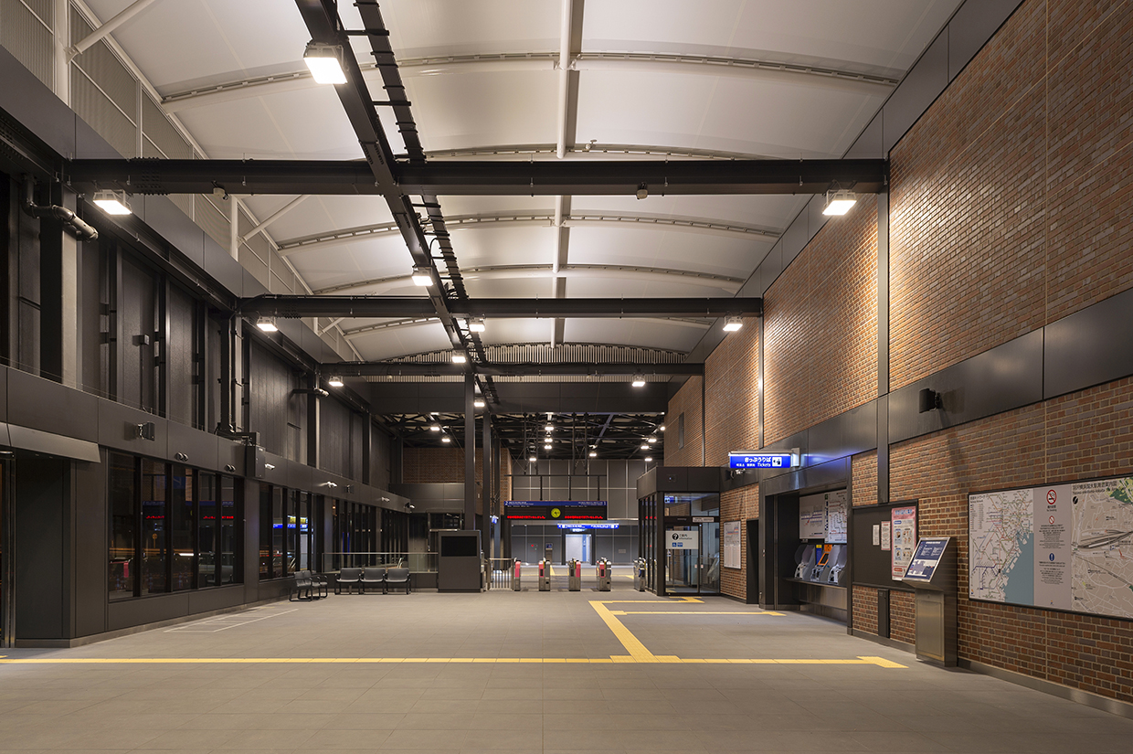 「人と触れ合う、自然と触れ合う、風景と共生する駅」をコンセプトに、光と風を取り込む膜屋根吹抜けのエントランスゲートから、プロムナードへゆるやかにつながる快適な広場的開放空間を創出し、鉄、レンガ、ガラスを内外装に組み合わせることで、時代の流行り廃れに左右されない時を経て醸成する古びないデザインとしました。