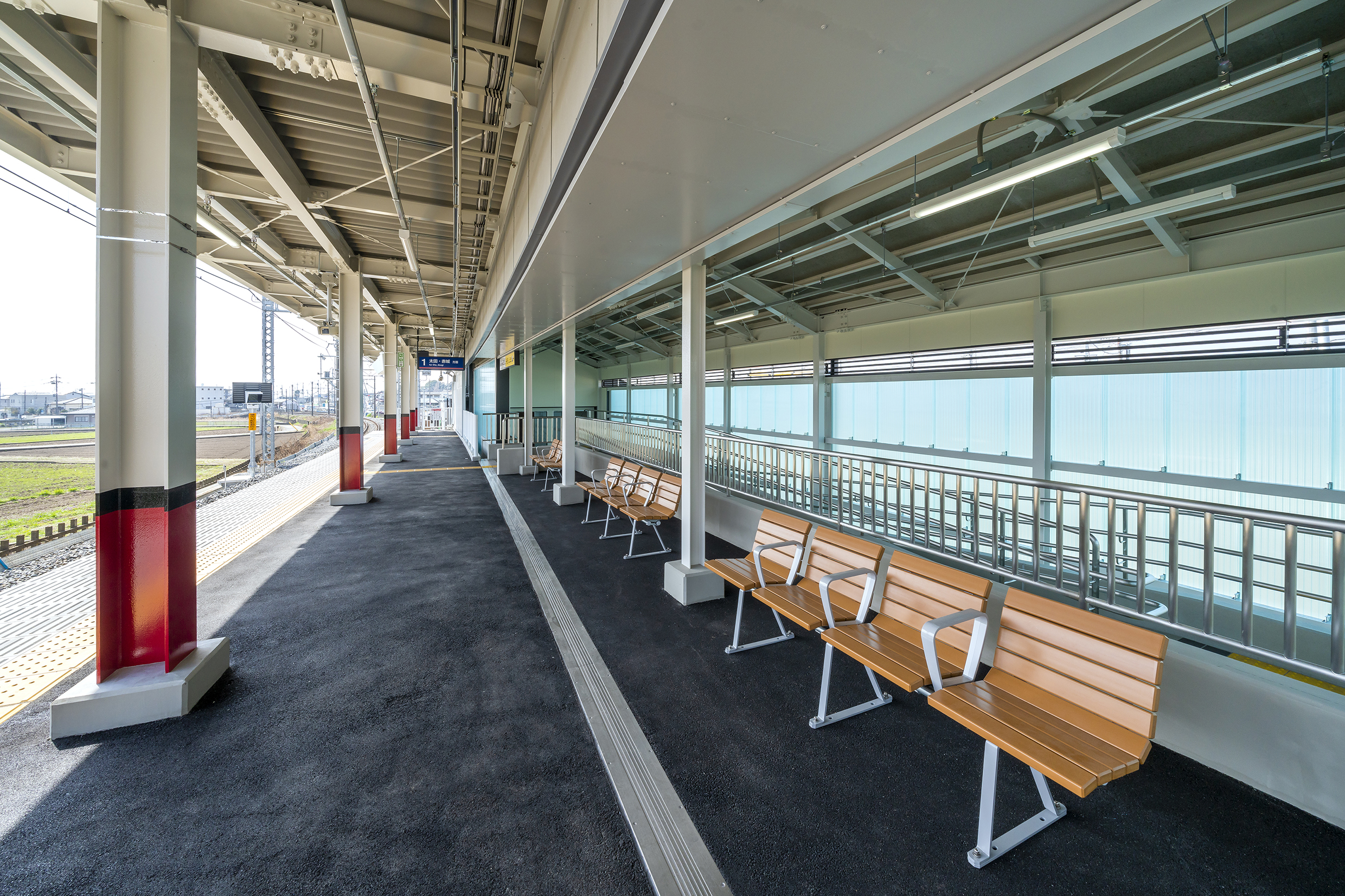 阿左美駅は1937(昭和12)年に開業し、その後のホーム拡幅工事中に縄文時代の住居跡が発掘され県史跡に指定されて以降、みどり市内の岩宿遺跡と共に貴重な遺産として現代まで伝えてきました。今回の移転にあわせて柔らかな自然光溢れる駅舎全体に、地域の財産として旧時代を彷彿とする黒曜石や地層をモチーフとしたデザインを施しました。