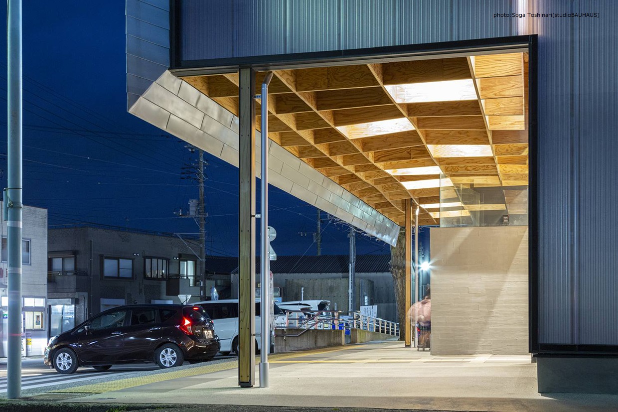 既存軸組を再利用し大幅リノベーションを行った。屋根はシンプルな形状へ変更し雨水漏水リスクを低減、仕上に超高耐食性の屋根材を使用してメンテナンス性を向上している。内部はLVL格子天井で波を、洗い出しの床で砂浜を表現した。格子天井の隙間から新築当時の小屋組みを見る事で、歴史の息吹も感じられる空間となった。