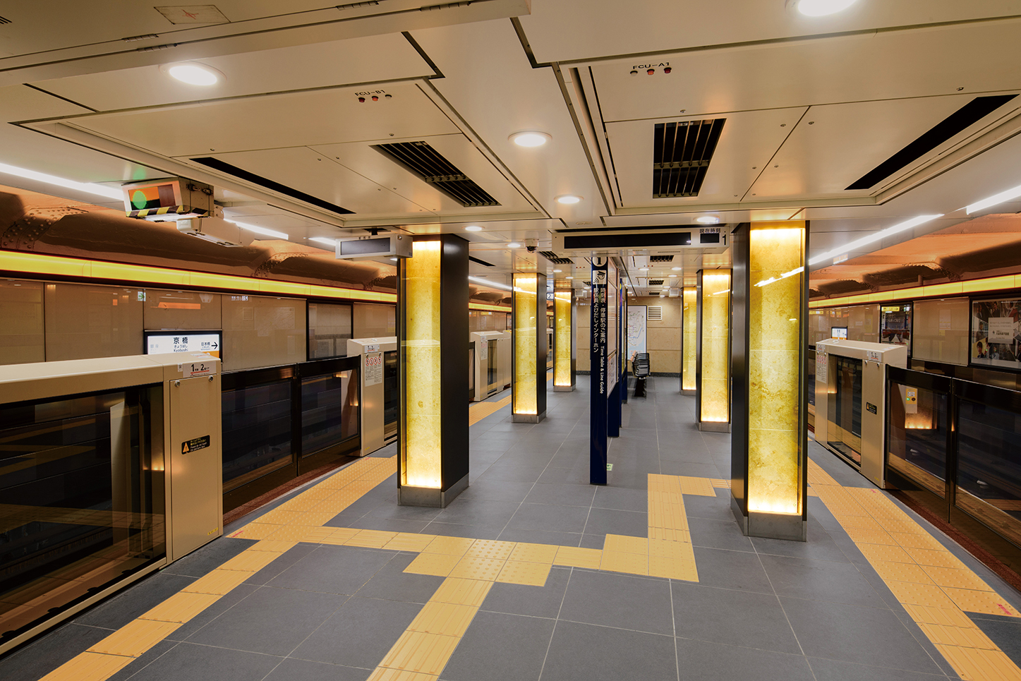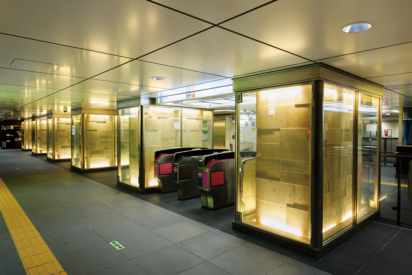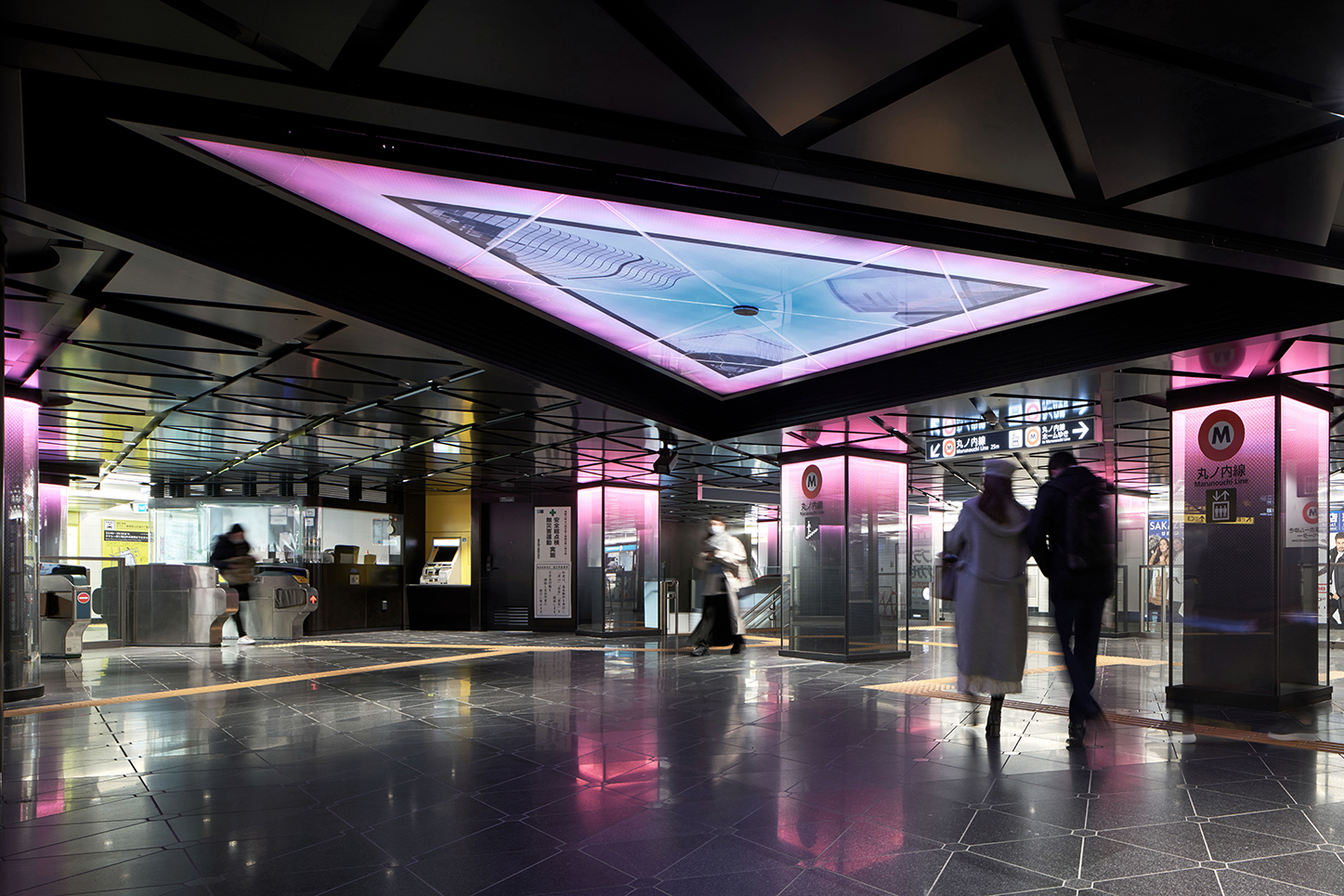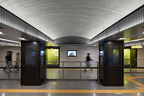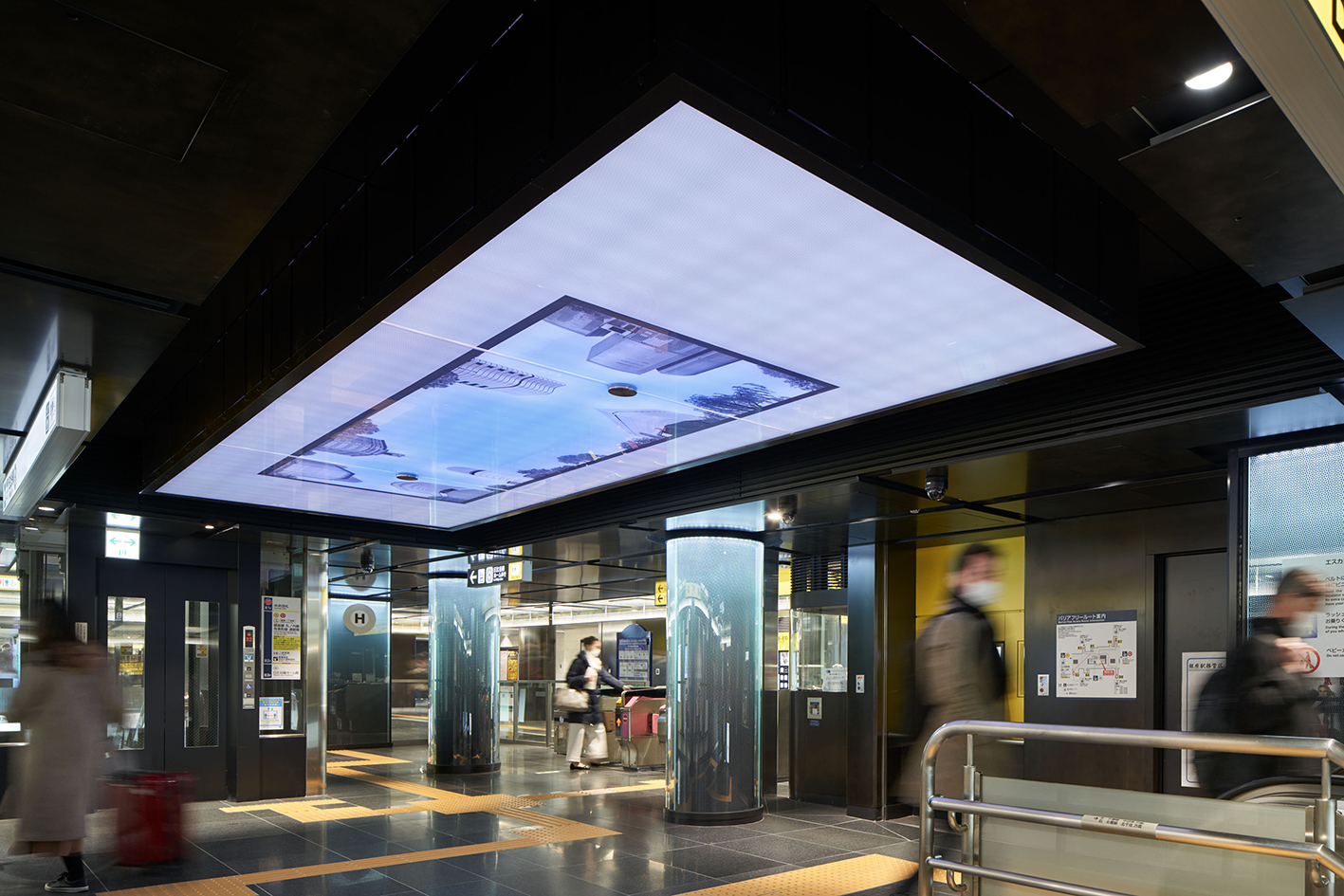 地下にいるお客様と地上の街を「光」で繋ぐように、天井や柱を各路線のラインカラーで美しくライトアップ。地上の光が地下空間まで届くようなイメージの駅を目指した。光が人の流れを誘導し、安心して駅構内を移動できる。息苦しくなりやすい地下空間に、光が安らぎや解放感・清潔感を与え、高級感のある居心地の良い空間をつくり出している。