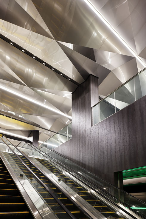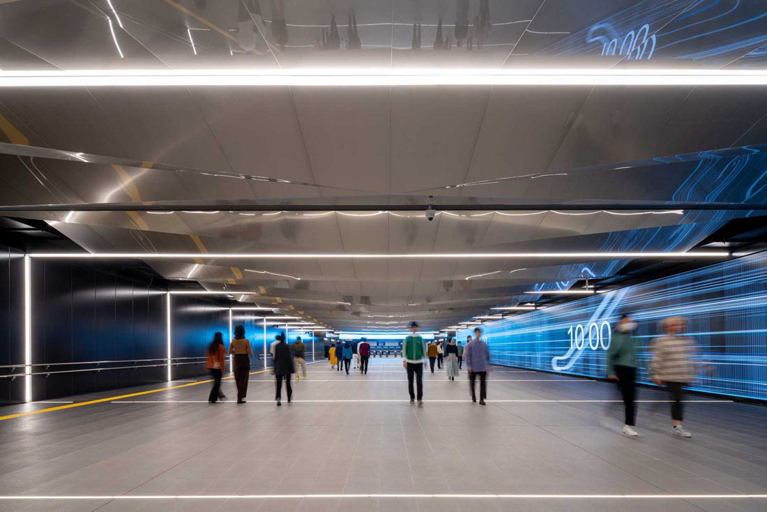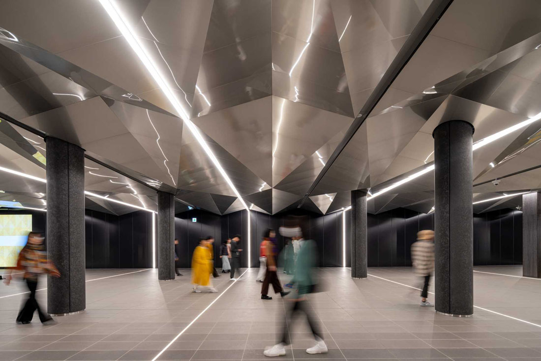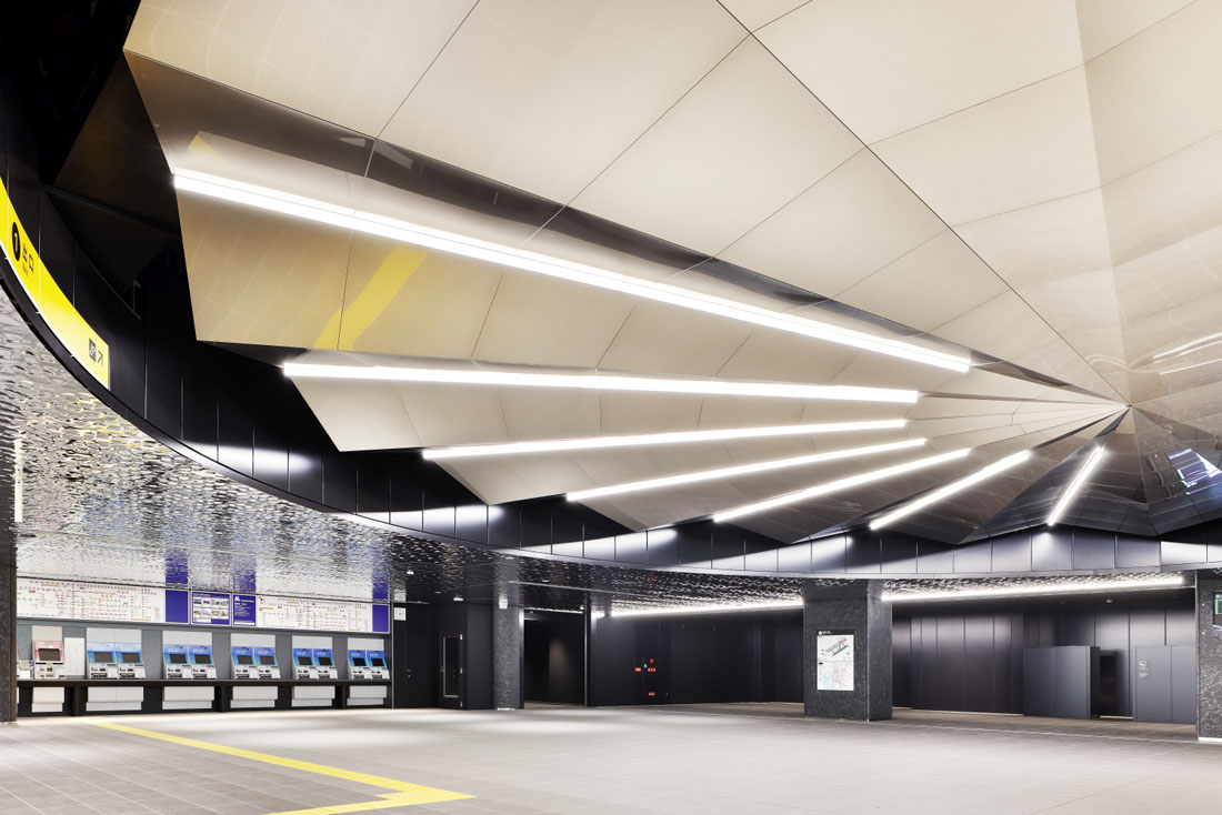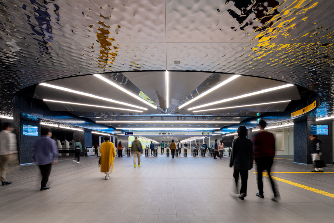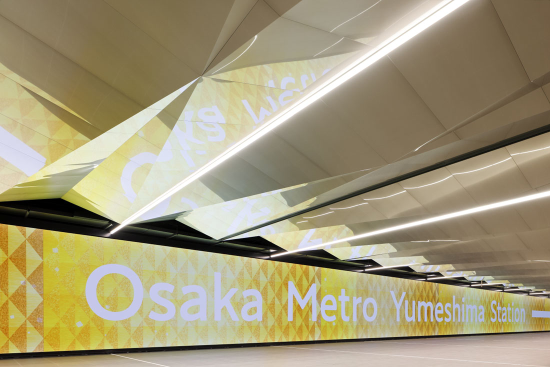 国際観光拠点の玄関として、まちと共に万博のレガシーとしても生き続け、駅自体が目的地となる。コンセプトは移世界劇場。 “動く(いきる)=移動”の魅力を発信する駅を、日本文化の要素を用い創り上げた。デザインの核である、運行ダイヤ図をモチーフにした鏡面の折り紙天井が、人々の姿や照明を映し出し空間を演出。人々を移世界へと誘う。