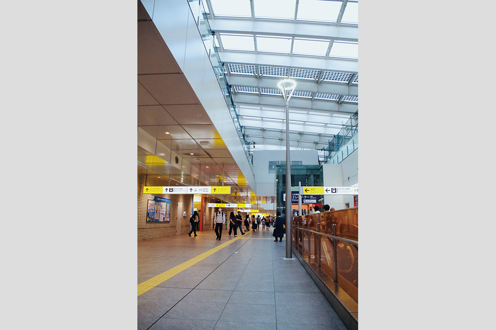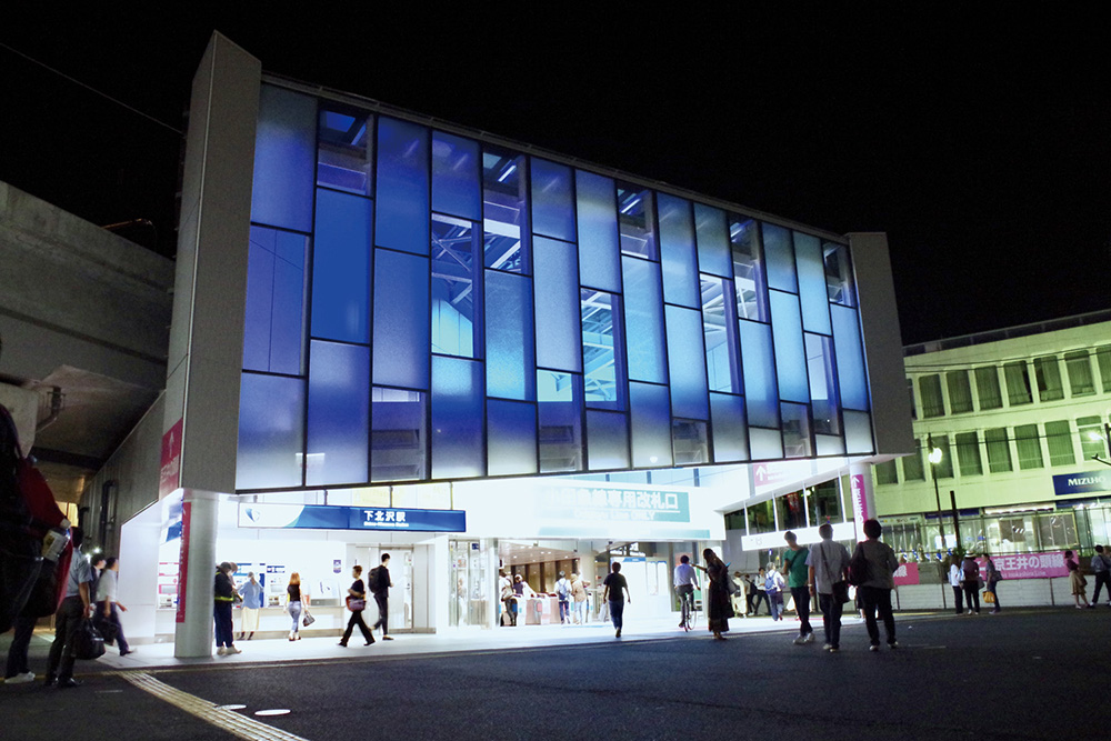 季節やイベントごとに色彩を変えるガラスのカーテンウォールは、多様な文化が混在する下北沢らしさを表現している。内部は吹き抜けのガラス天井で開放感を感じられるとともに、太陽光パネルを設置し環境対策も行っている。トイレには「こどもトイレ」の設置や乳幼児設備の完備等、機能分散及び拡充を行い、利便性向上を図っている。