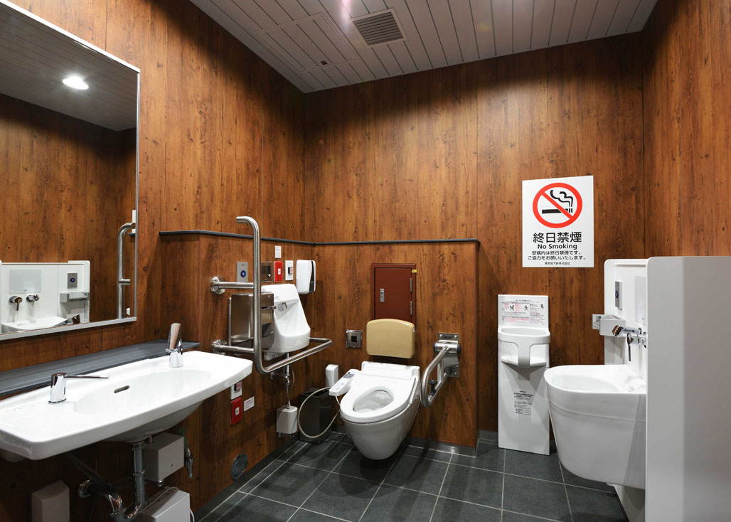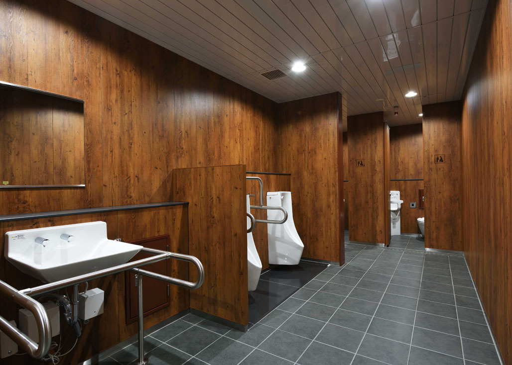 - 特徴的な仕上げ材外壁:メーカー名;ダイナワン、品名;ETIC(外装タイル)/建具:メーカー名;不二サッシ、品名;アルミ製トップライト/天井:メーカー名;アサヒ金属 品名;アサヒスパンドレル メーカー名;3M、品名;3Mダイノックフィルム(スパンドレルシート)/壁:メーカー名;ニチアス 品名;アスラックス(化粧けい酸カルシウム板)、メーカー名;アイカ工業 品名;メラミン化粧板、メーカー名;3M、品名;3Mダイノックフィルム/床:メーカー名;エービーシー商会 品名;フェロコン・カラークリート(無機質系塗床)、メーカー名;安藤大理石 品名;花崗岩・磁器質タイル(乗降場)、メーカー名;INAX 品名;磁器質タイル(一般トイレ・バリアフリートイレ)