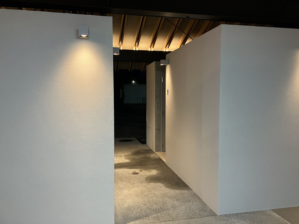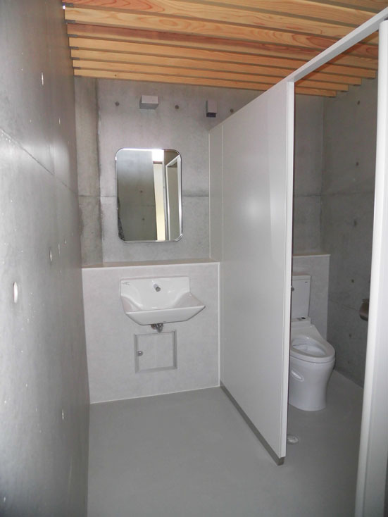 - 特徴的な仕上げ材屋根:メーカー;日鉄鋼板(株)品名;ニスクカラーPro/外壁:【トイレ】メーカー;アイカ工業(株)品名;ジョリパット【待合所】コンクリート打ち放し(杉板型枠仕上げ)/建具:メーカー;文化シャッター(株)品名;カームスライダー他/天井:メーカー;ニチハ(株)品名;センチュリー耐火野地板 香川県産ヒノキ材/壁:コンクリート打ち放し/床:【トイレ】メーカー;中外商工(株)品名;アートフロアー【待合所】モルタル洗い出し仕上げ